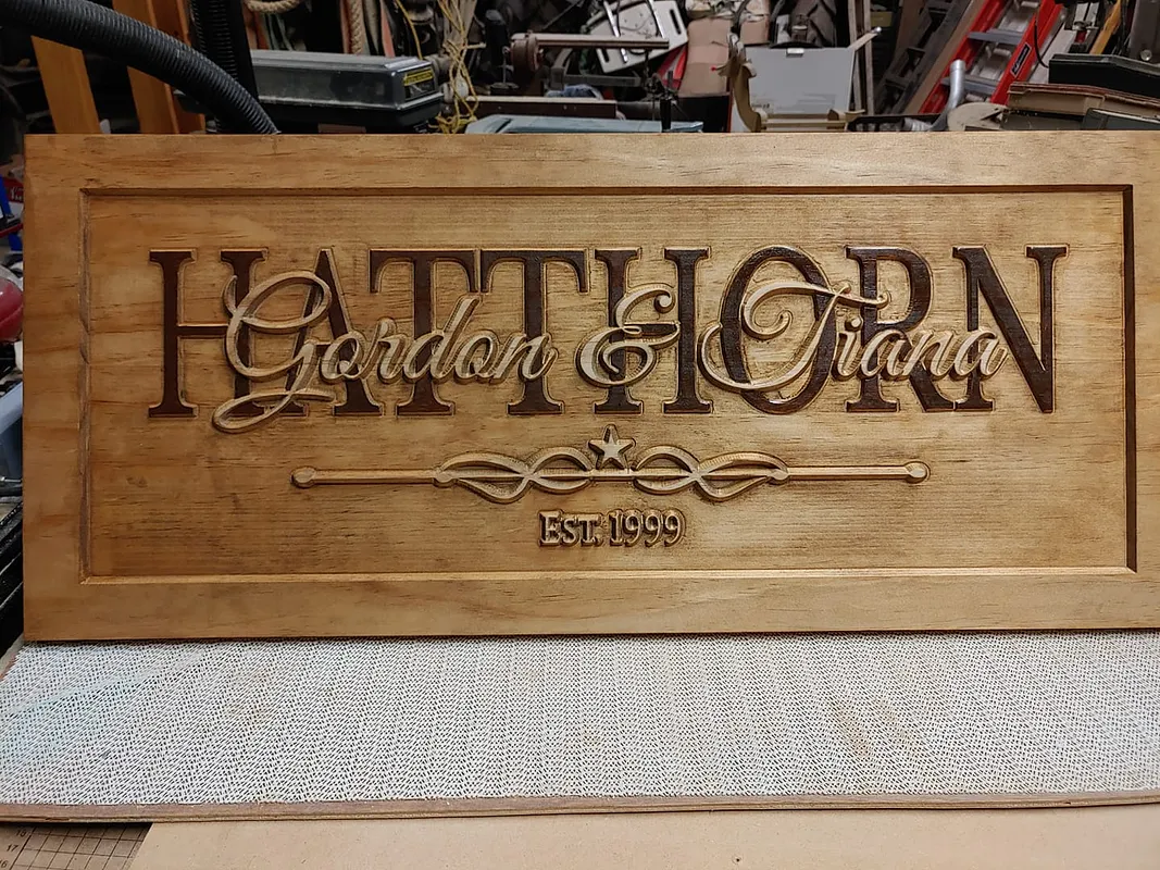 After about 24 hours and the stain is dry, I'll use 120 grit on my orbital to sand off the top of the uncarved stuff, first names, 'established', and the design.