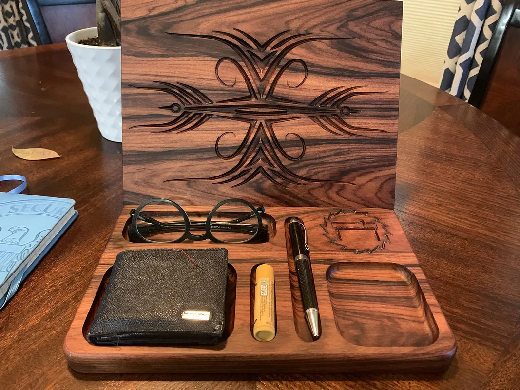 This CocoBolo bookstand / valet tray measures 8” x 11.75” and support a notebook measuring the same. The stand has an angle of 30 degrees. Let me know what you think