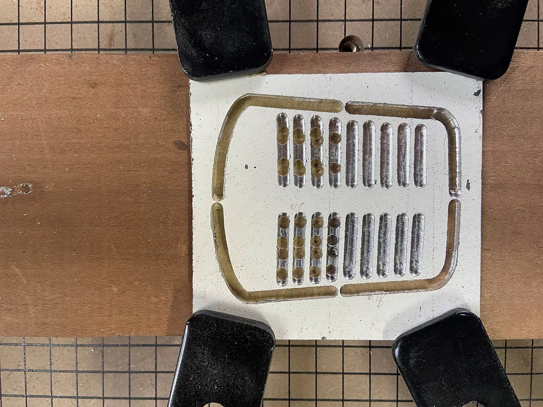 First attempt, depth issues. Outside milled as expected but had random depths and patterns on the slits. The image the SW generated looks correct but for example the bottom slits are .06" shallower than the outside border. No idea why there is a repeated plunge pattern in the top 5 slit sets