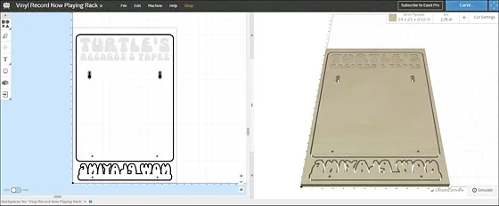 If you want to use a different font for the Now Playing piece, type your text in Easel using a thick font. Use ALL CAPS so there are no loose objects, like the dot on the letter i. Draw a rectangle across the bottom of the letters and combine it with the letters, so that it connects all of the letters together as a solid piece. Flip it upside down and add mating dowel holes in the piece and backboard for attaching.
