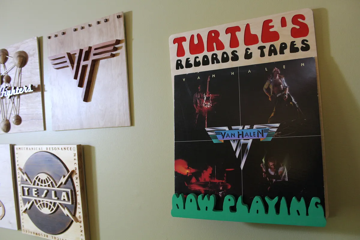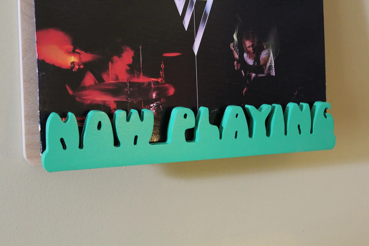 The design uses keyholes to hang it up. This makes it easy to hang and take it down if needed. I plan to make a couple more with different record store names and switch them out occasionally. Now put on a record and display the album cover in style while you listen to it!