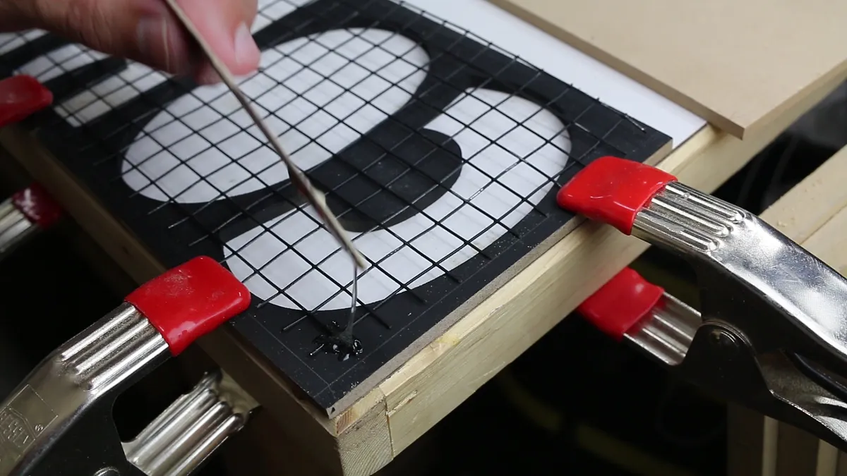 Using epoxy(or strong glue) glue a pieces of chicken wire to the back side of the CORKS pieces. I used 1/2" x 1/2" square chicken wire. The chicken wire should be roughly 5.5" x 15.5". Make sure the chicken wire is set back 1/4" from all edges so that the CORKS sign will fit in the box.