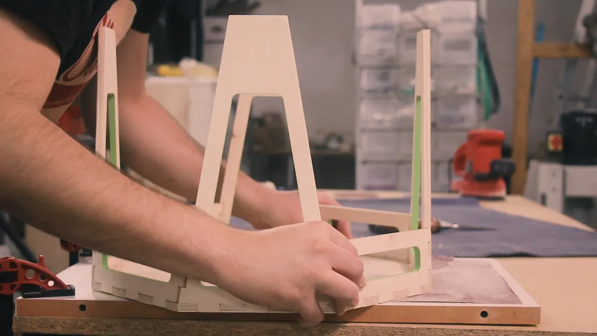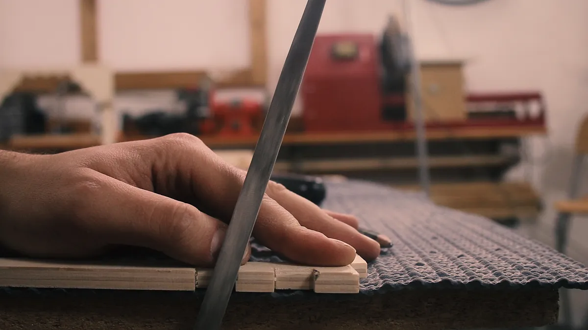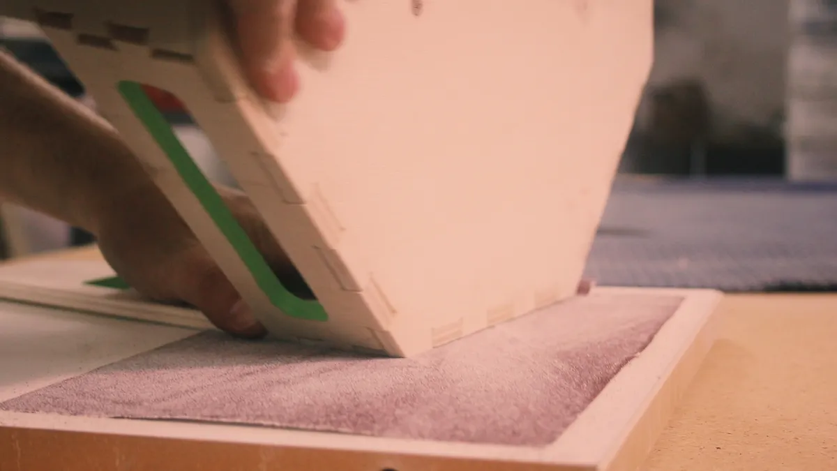 The fingers are meant to be a bit proud so they cand be sanded down after glue up. A flat surface and some sandpaper with double-sided tape will do. Take a few pases along the edges as well so the table it's nice to touch!