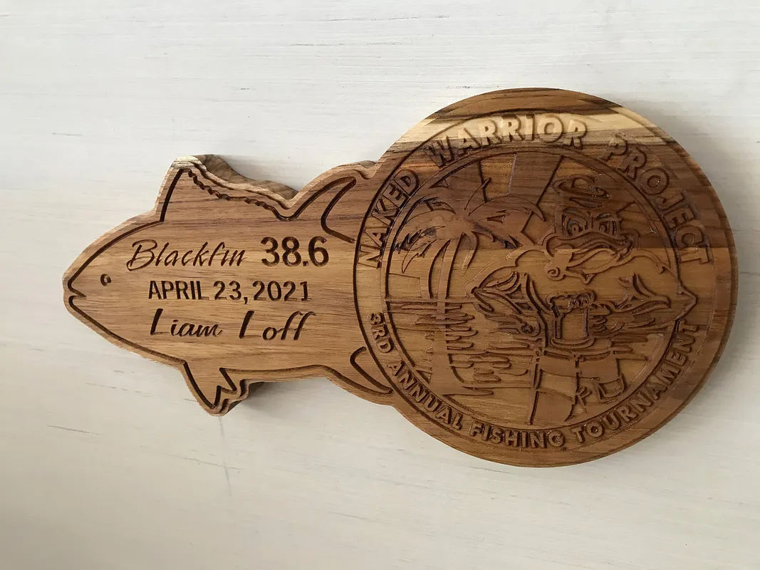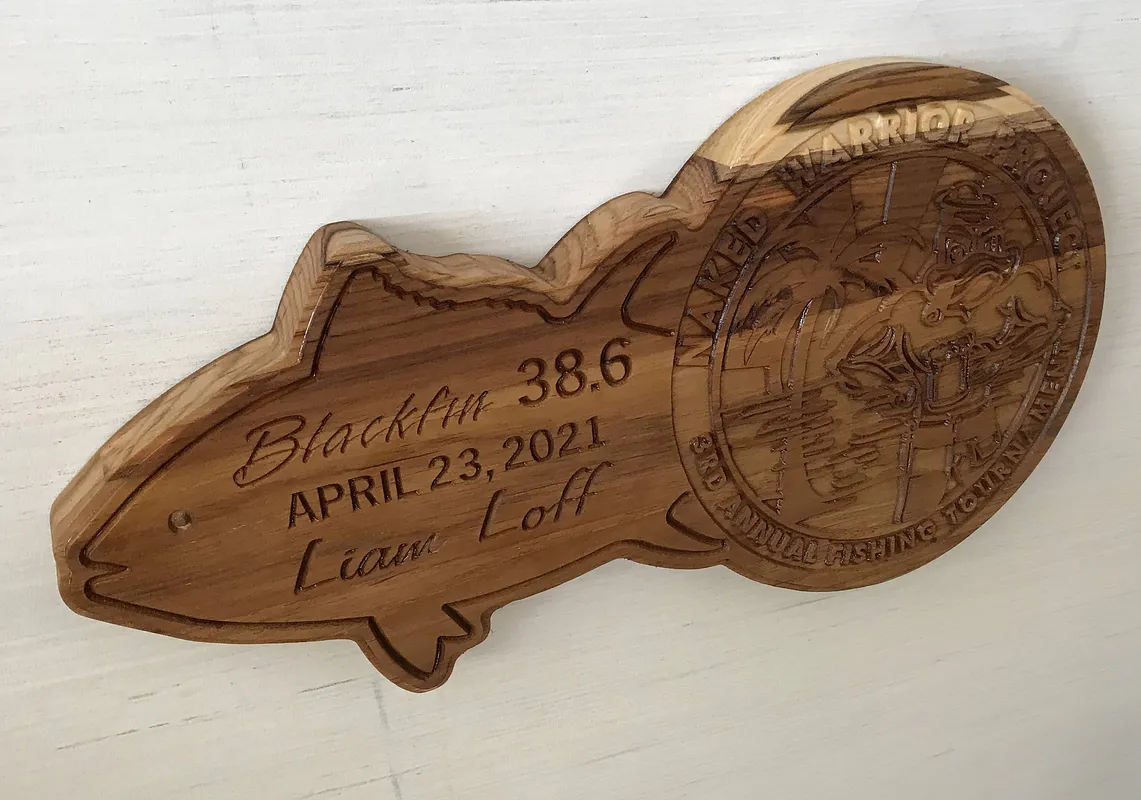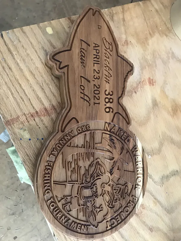 used tuna from easel art files incorporated into my design used 1/8 bit to rough carve 60 degree vbit to carve details and a 1/4 compression bit for the step edge and carve out