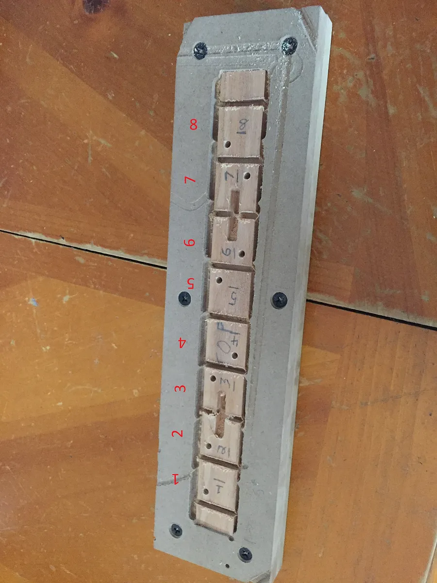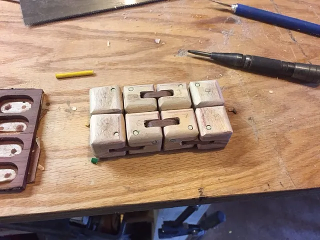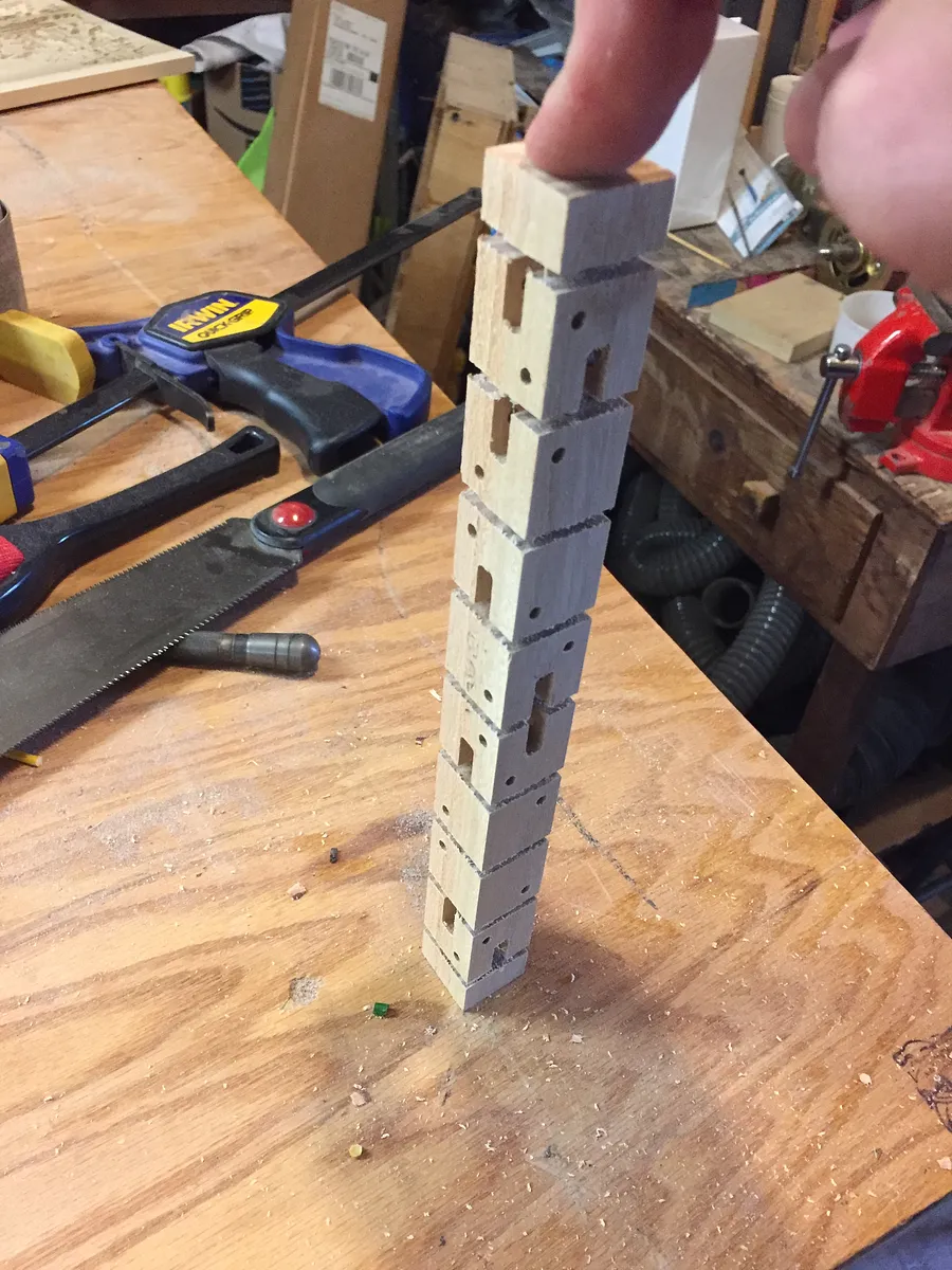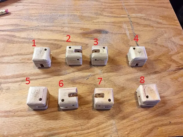 From this piece of wood, we will cut out 8 little 1" cubes (see pic 1) which have slots for the hinges and holes for the dowels.