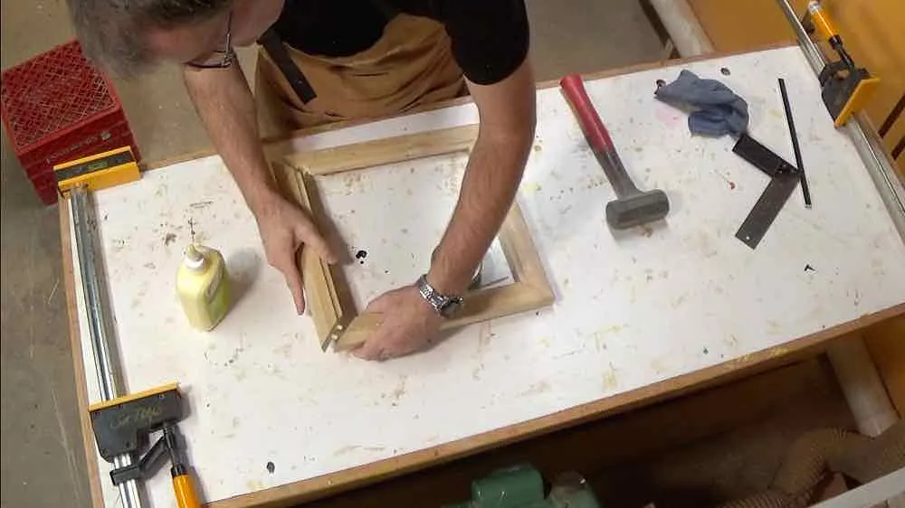 A strap clamp, which wraps around the entire frame, would make this very easy. I don't have one, so I added dowels to the ends to help lock everything together while it is clamped, so that it will not slip. Another option would be to use small nails from the top/bottom where they would be almost unseen.