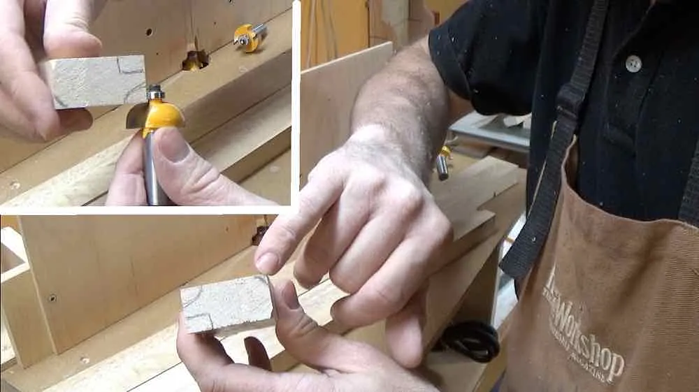 A simple rectangular shaped frame would be pretty straightforward, but I'm aiming for better than that. Here (2nd photo) I am showing the 3 cutting operations that I will make on the router table to make some nice molding to frame the plaque. First I will use a roundover bit to curve the outside edge. Next a cove bit (inset photo) will be used to take out a quarter-circle shaped chunk of wood. And finally a rabbeting bit (in the background of the inset photo) will be used to make the notch where the plaque fits in the frame.
