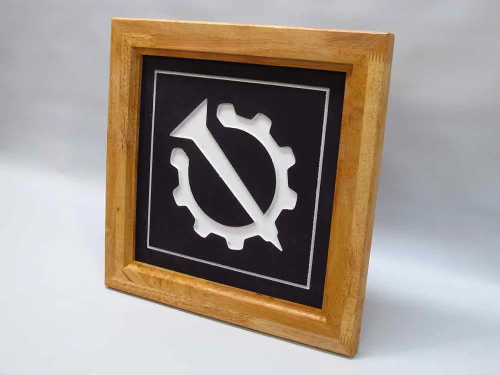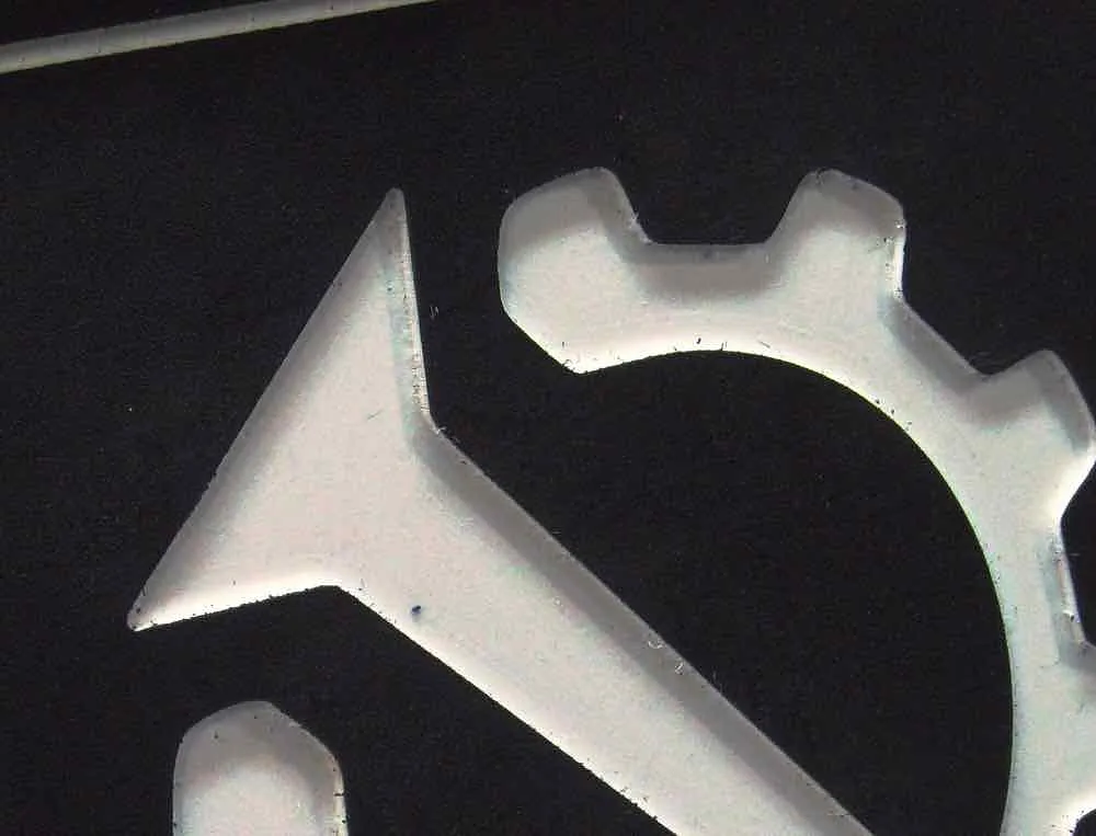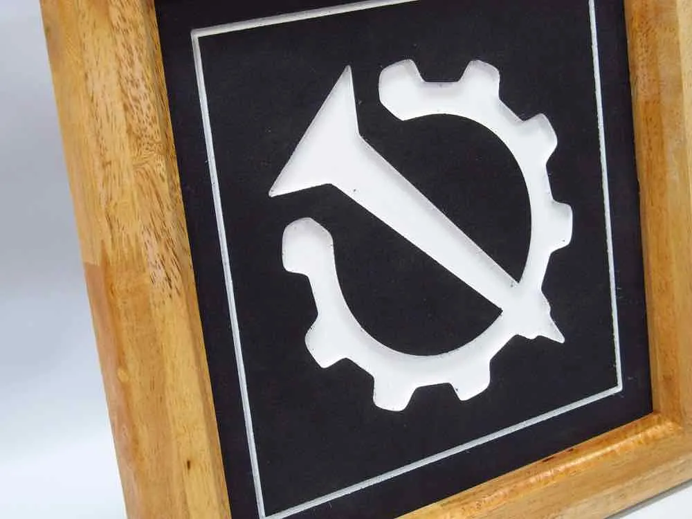 This is made with two-colour black-and-white HDPE. It was a mess to carve (dust collection is needed!) but the results are really nice with the carving showing up as white on a black field.
