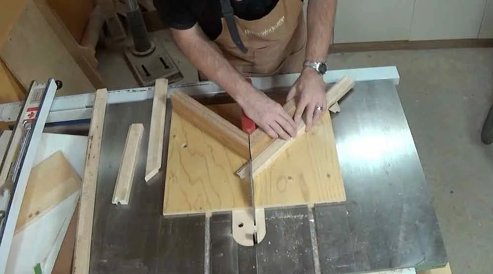 After that I take it back to the tablesaw and use a 45-degree cutoff jig to make the mitered corners of the picture frame materials (You could use a miter saw if you have one.)