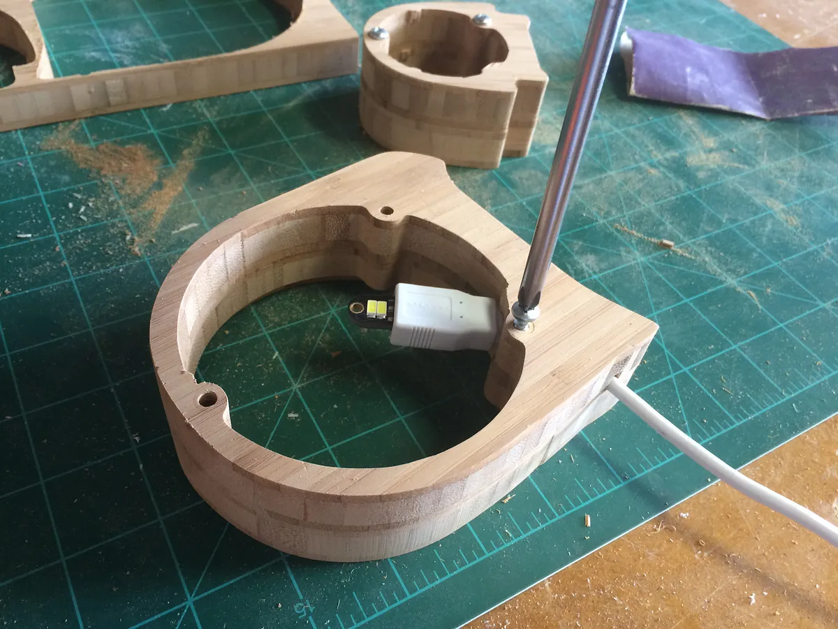 Insert the USB cord in the slot and assemble the frame.