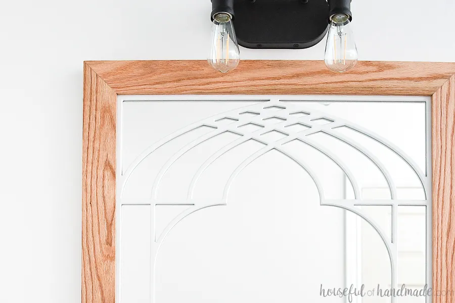 Carve a window frame designs to overlay in your mirror frame creating a stunning window frame mirror. This design has an open center area so it's perfect for a bathroom.