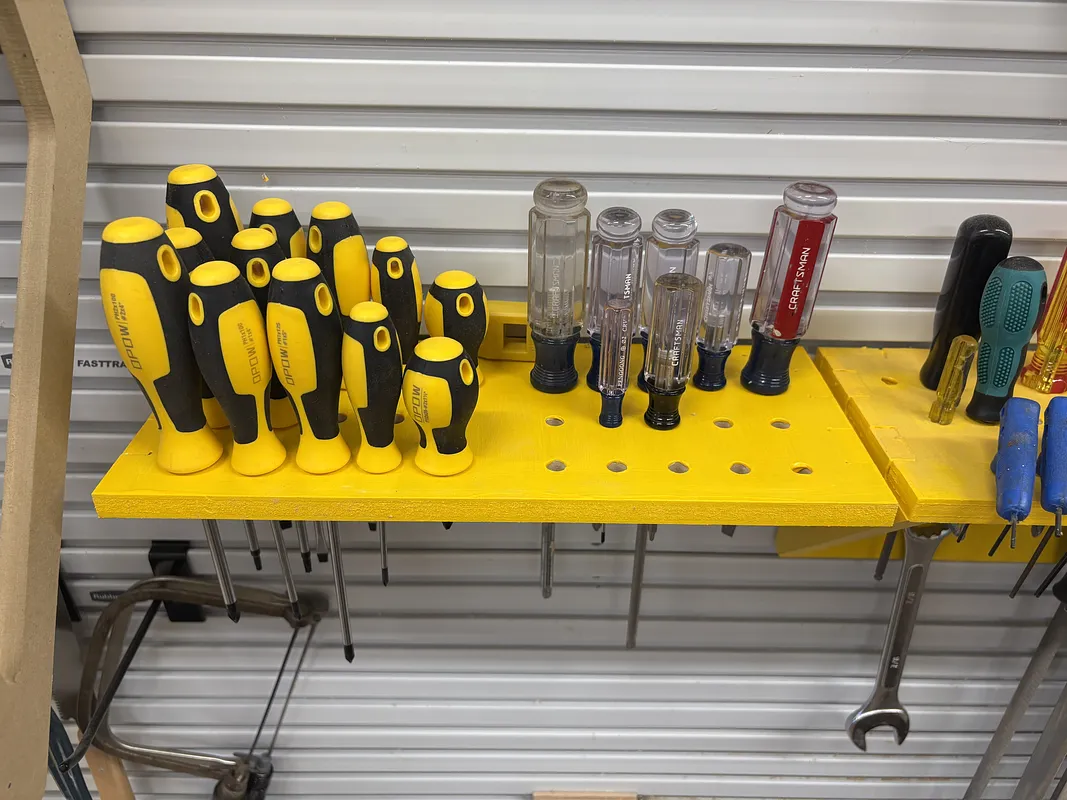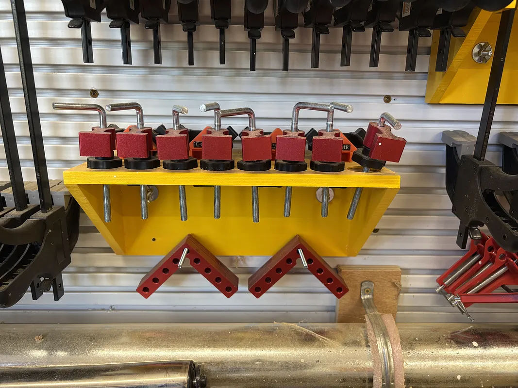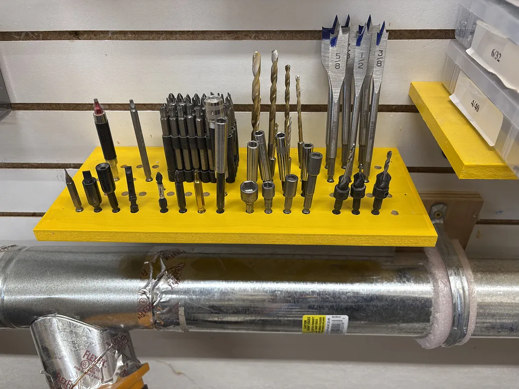 Includes racks for screwdrivers, hex driver bits, corner clamps, and bench dogs.