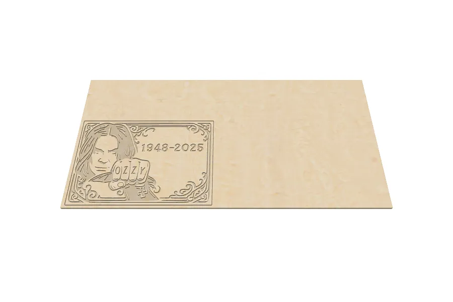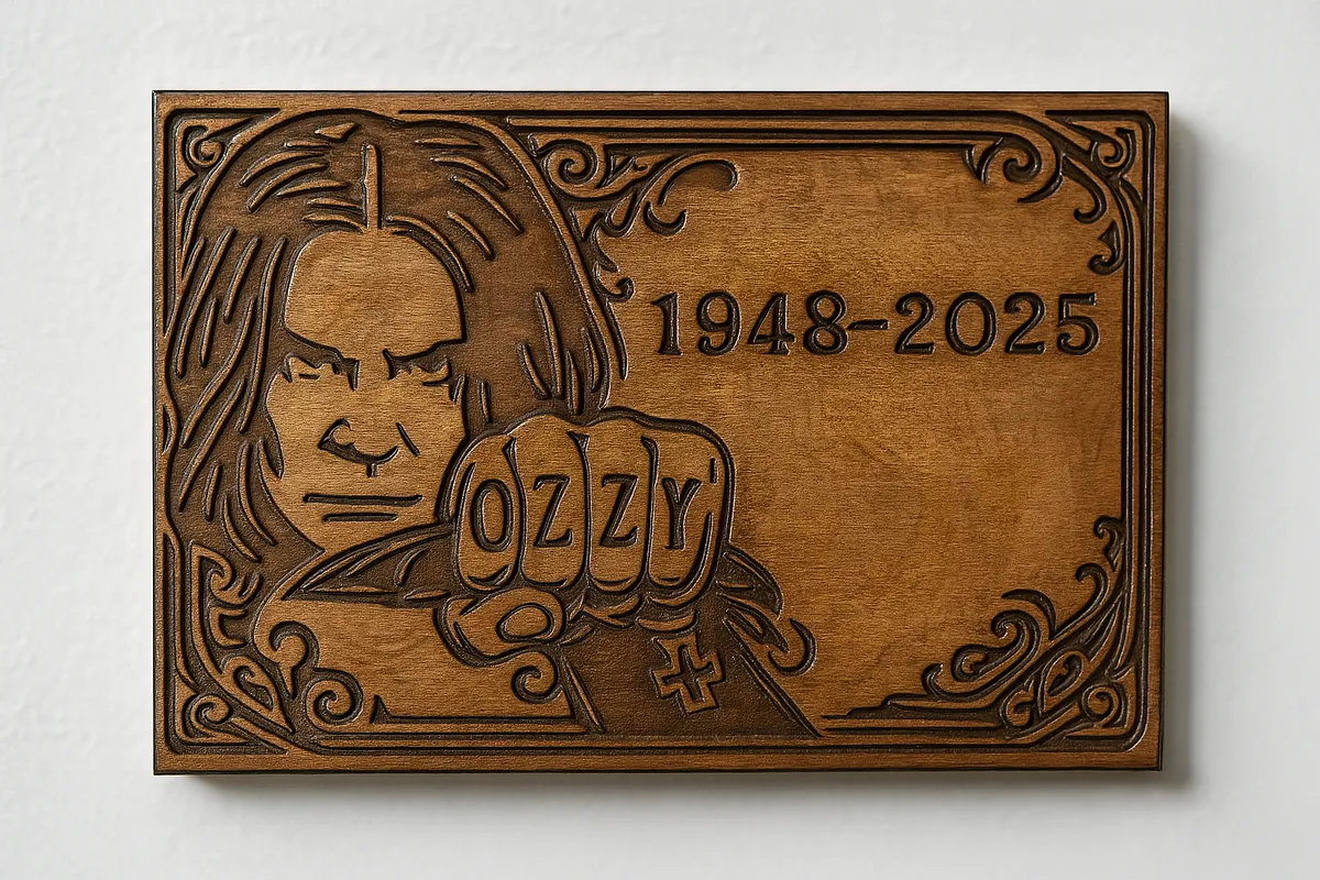 This wood plaque honors Ozzy Osbourne with his portrait, iconic 'OZZY' fist, and the bat he bit the head off of. It's a tribute to the Prince of Darkness and his legendary impact on the world of rock and roll.