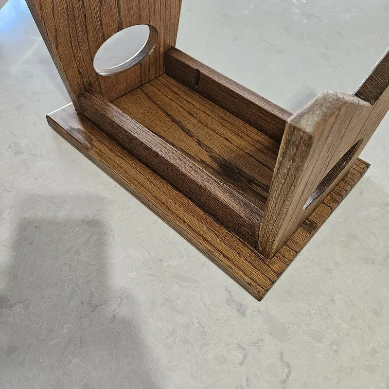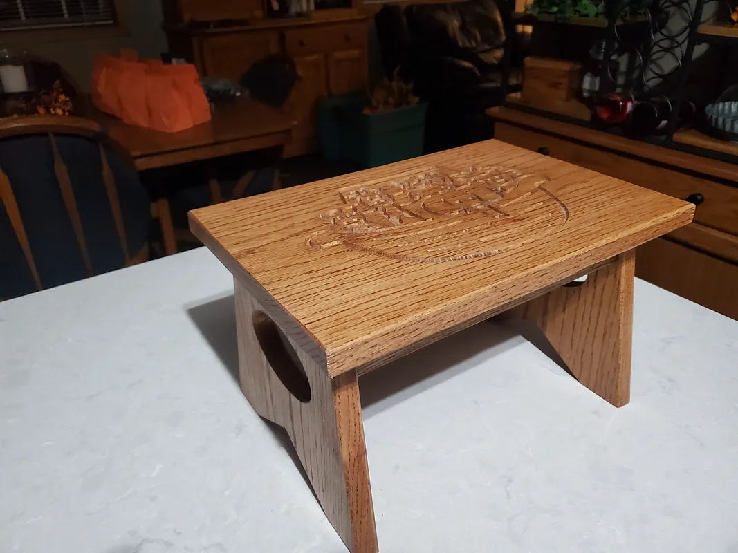 Top of stepstool is 9.25" x 14", Legs are 9.25" X 7.25" and .side braces are 1.5" x 11". Carve top of stepstool with your own design. Flip board to carve small inlay for legs and side braces. Carve legs and cut side braces to fit. I glue and use 4 pocket screws to hold legs and braces together (they are hidden by the top of stepstool). The pocket screws are drilled and screwed into edge of brace as the screw will go into the leg. I then glue and use 4 pocket screws to fasten top of stepstool to the base. I have made stepstools with a custom name on the side of legs before assembly. Finish sanding, stain and finish.