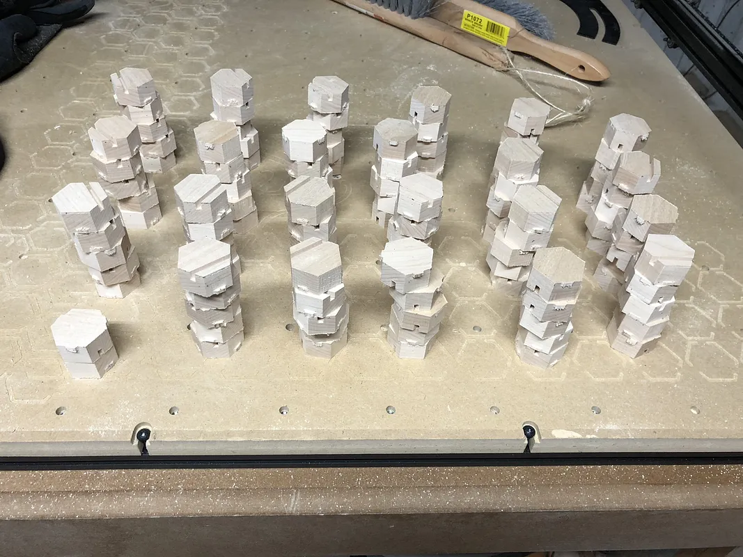 Small hexagon blocks that are great for holding up card stock. I made these for our wedding. Will post pics of it in action soon. If you plan on people moving these from one table to another, use a dab of glue before inserting the card to hold it in place.