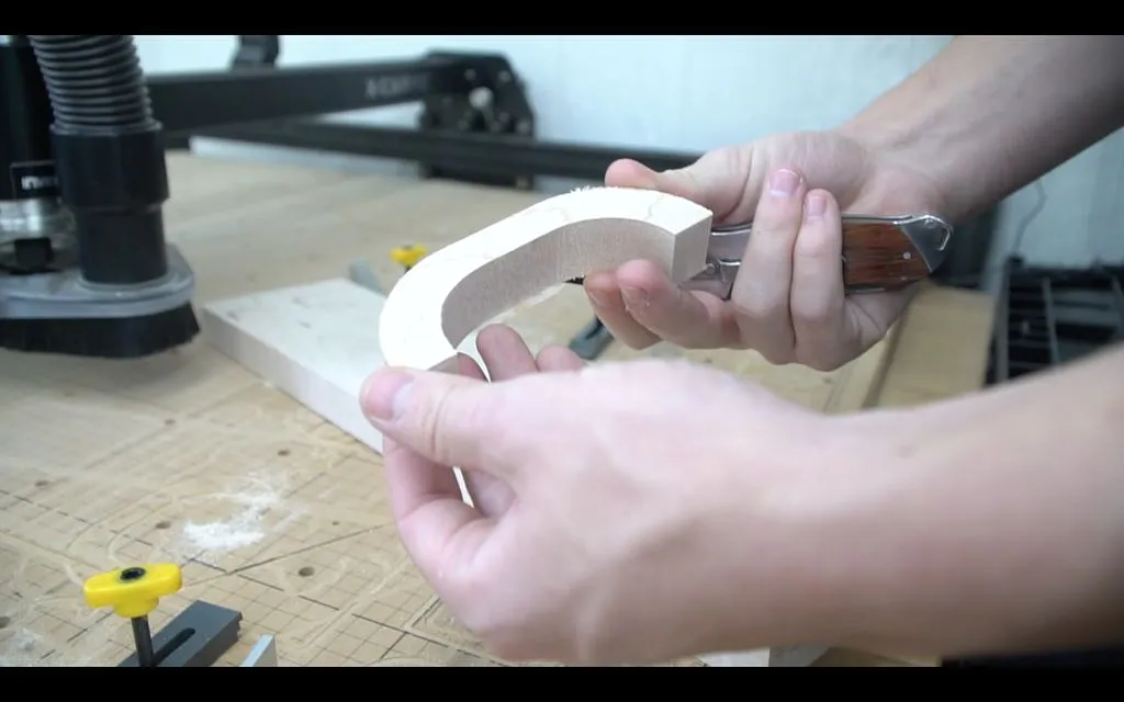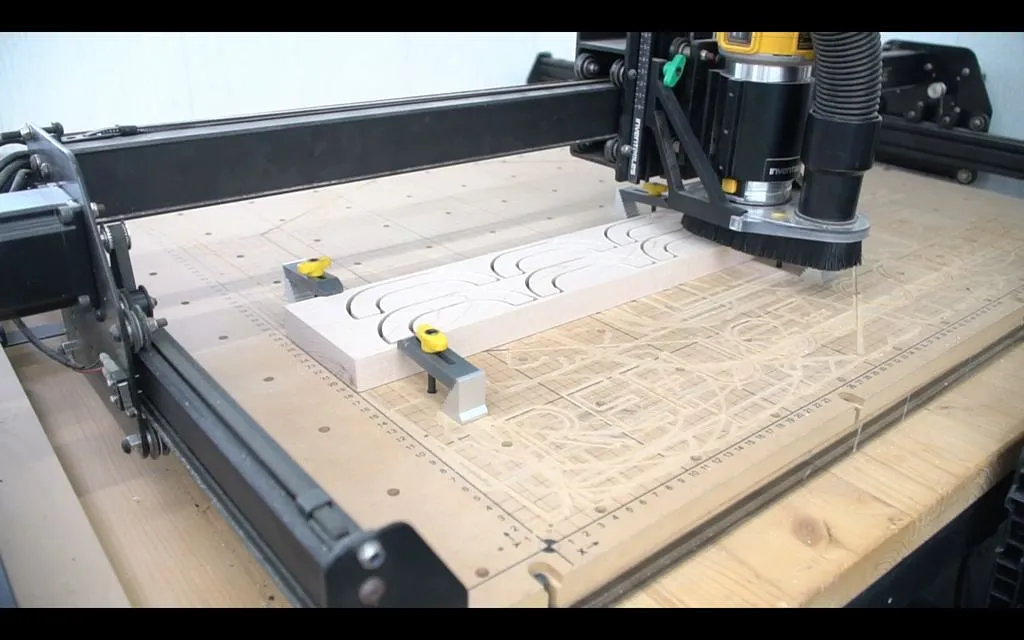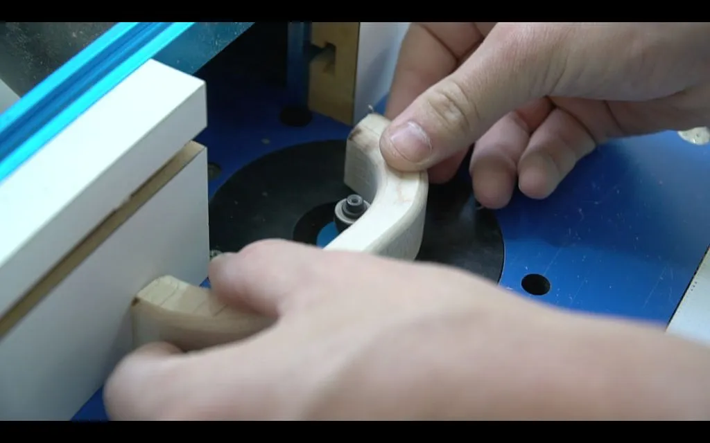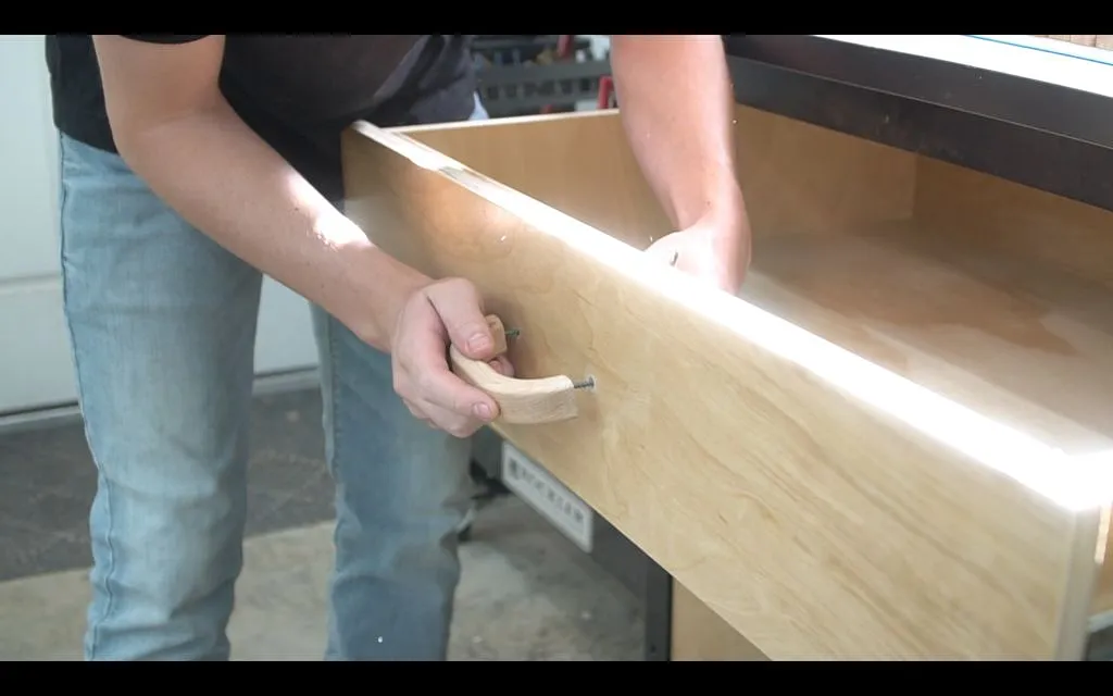 First use the attached Easel file to carve the outside shape of the drawer pull. Next round over the edges using the router table or sand paper. After a bit of hand sanding we applied a wax finish to the handles. We used this Rockler jig to mark the hole locations (4" apart) on the handles and pre drilled the holes. Lastly we attached all the handles to the drawers using wood screws.