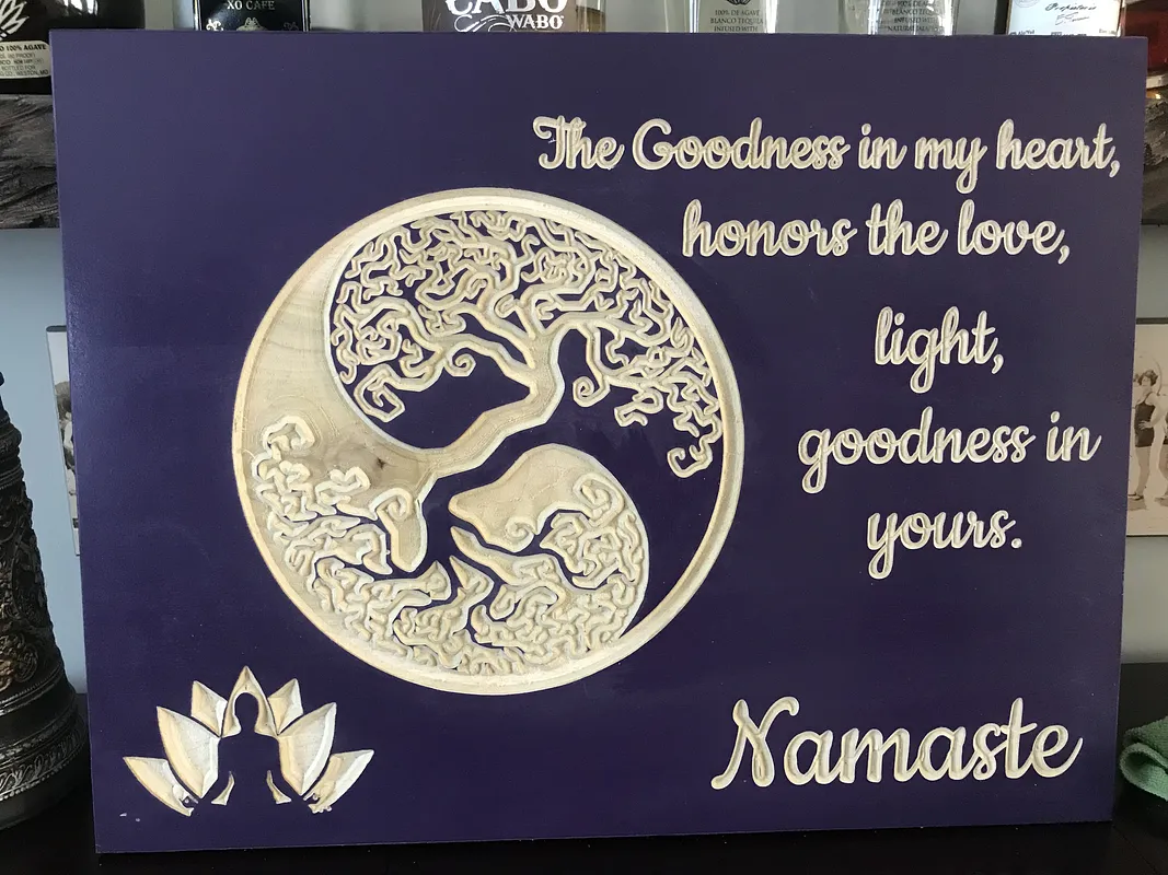 I wanted to do something for my Yoga teacher who has helped me on my healing process after a torn ACL. This is my first time at 3D carving. I used a 90 degree bit on birch plywood 3/4 inch.