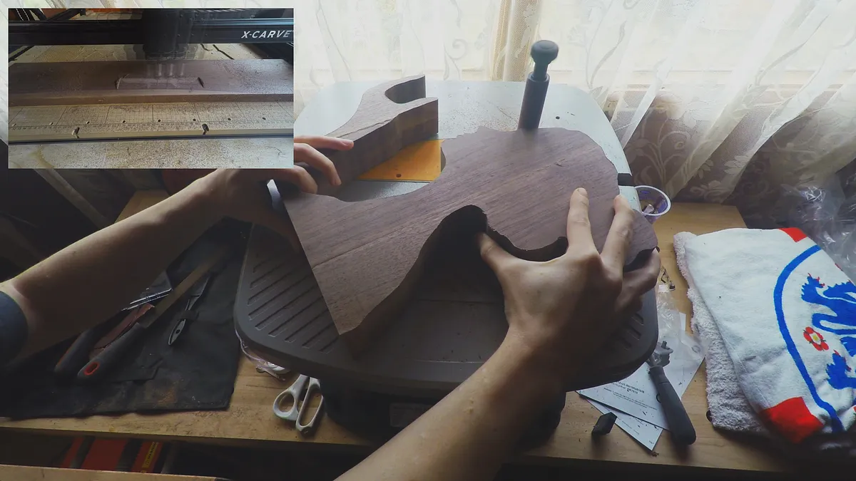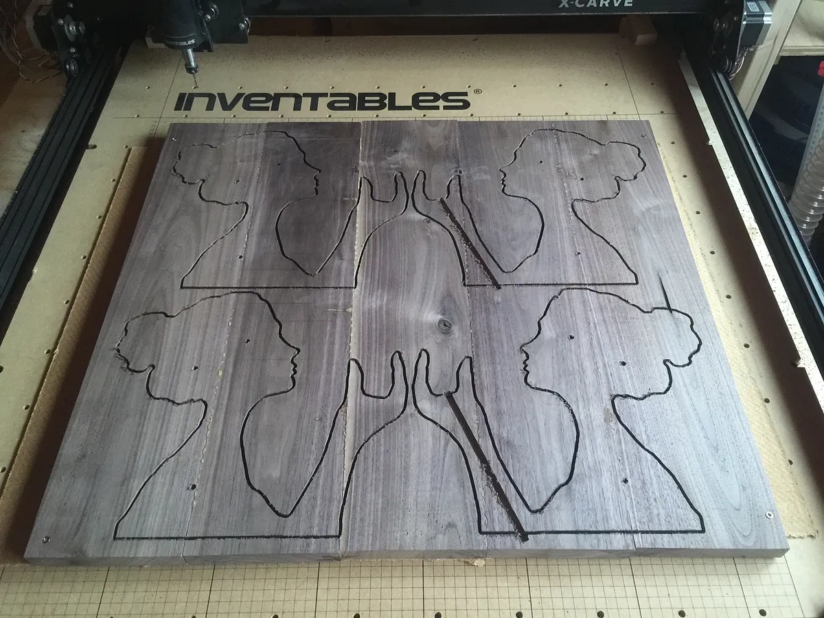 I secured the walnut panel down to the X-Carve waste board with screws and I used some hardboard underneath to protect the wasteboard from the bit when it cuts through.