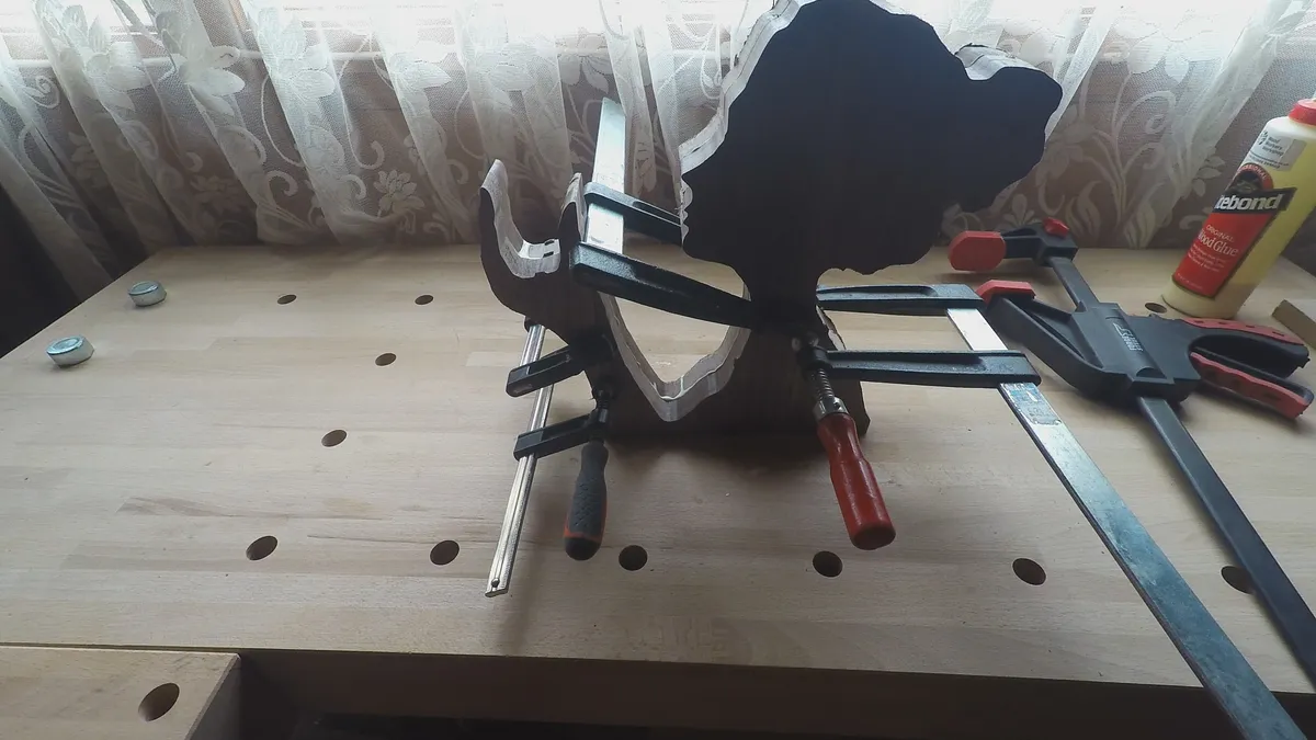I added a dab of glue into each hole and inserted a wooden dowel into one side. I then spread an even layer of glue all over and sandwhiched the 2 pieces together, making sure the dowels line up with the mating holes. These stop the pieces from sliding round when I added clamps and they helped to keep them aligned correctly.