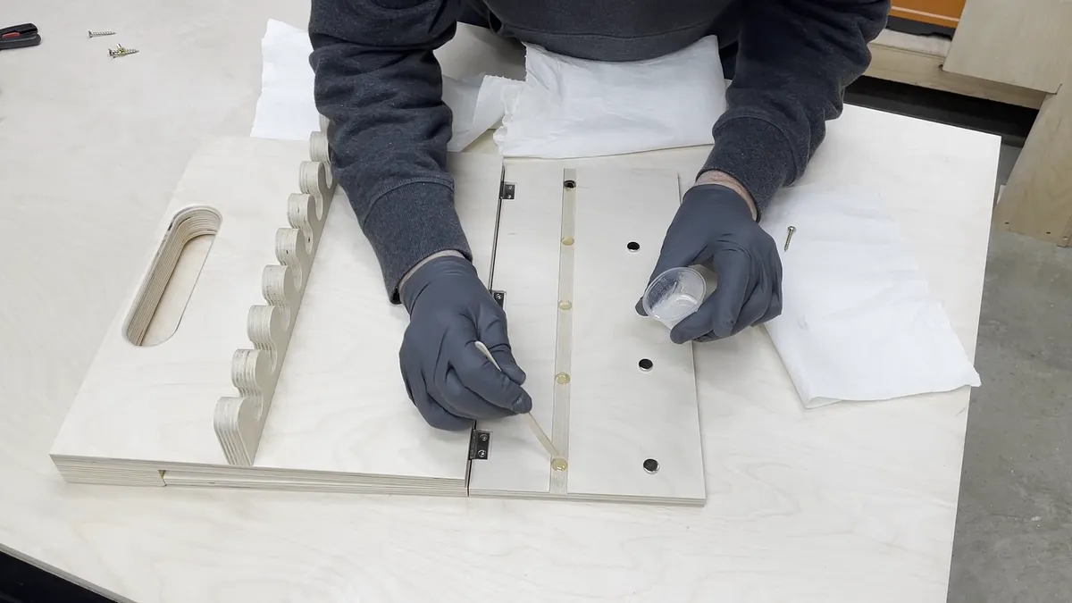 Try to not use too much epoxy when setting the magnets. This will make it easier to clean up the excess. Put a little epoxy into the magnet hole and then press the magnet into the hole. It helps to press the magnet into the hole with a small scrap piece of 1/2" thick plywood to set the top of the magnet flush with the bottom of the dado (groove). Once you press the magnet in you should remove any excess epoxy that squeezes out from around the magnet.