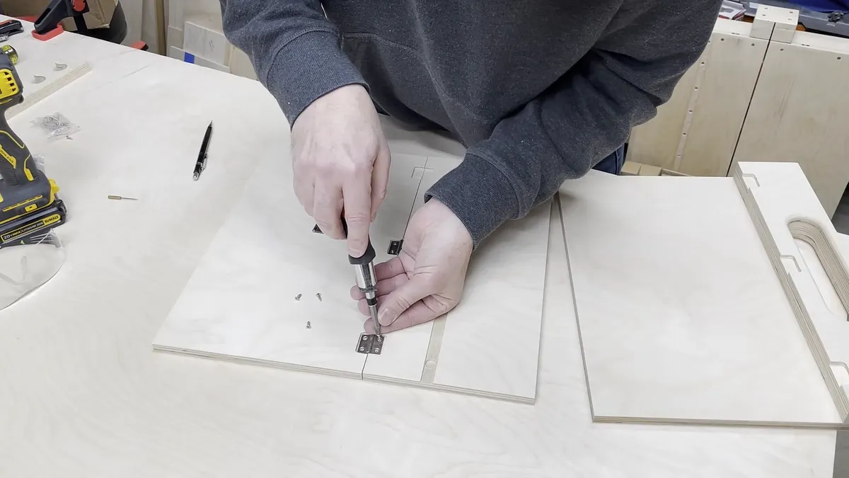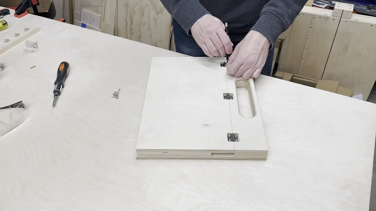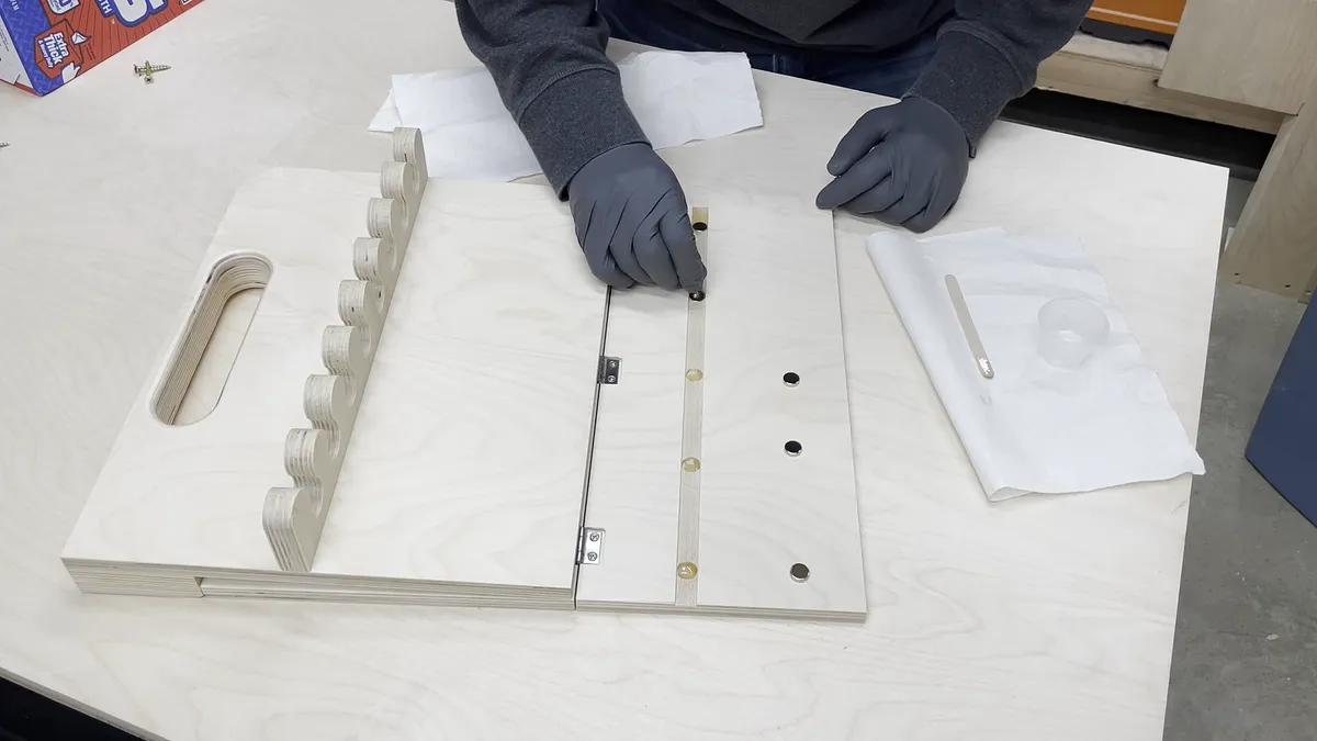 1/2" Baltic Birch plywood 3/4" Baltic Birch plywood Various sand paper General Finishes Water Based Topcoat (Satin) - "Link":https://amzn.to/3Ep8lVG Total Boat Thick Set Epoxy 1.3 Quart Kit - "Link":https://amzn.to/3jK8DON or Total Boat High Performance Epoxy 1 Quart Kit (medium set speed) - "Link":https://amzn.to/3aITVD0 1-1/4" and 1-5/8" long #8 construction screws 1/2" diamter by 1/8" thick Multi-Use Fridge Magnets - "Link":https://amzn.to/3Hu2a4h Miniature Hinges - "Link":https://amzn.to/3FOvnqc