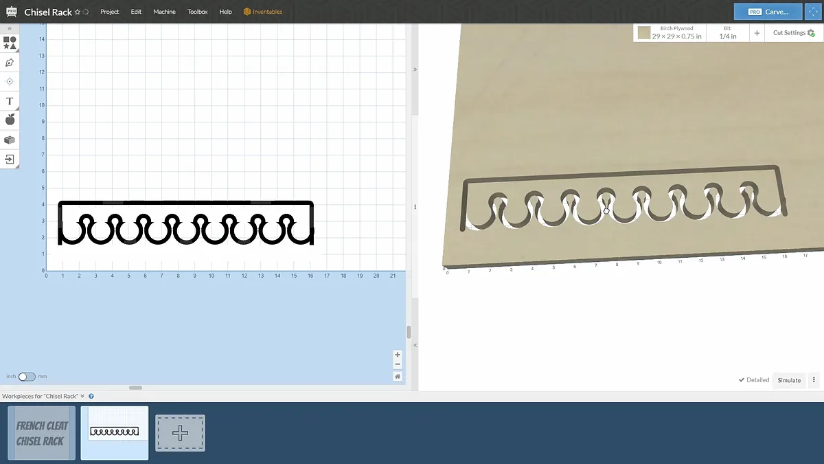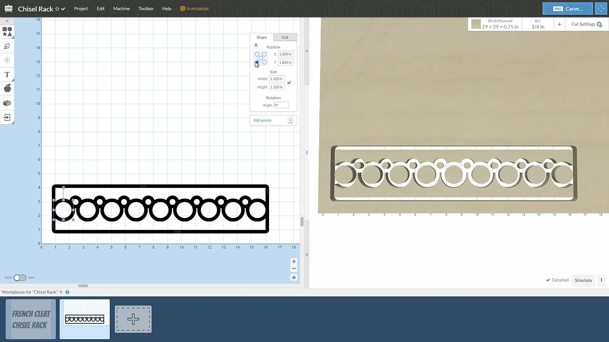 Start out with a 3" by 15' rectangle at 1,1 Add a 0.925 x 0.925 circle at 1.98, 2.537 Make an array with one row of this at 1.73 in x direction with 8 items Add a 1.155 x 1.155 circle at 1.00, 1.00 Make an array with one row of this at 1.73 in x direction with 9 items. Now we are going to slide these circles up to a point where they match the radius of the smaller circles where the chisels will rest. Just keep moving these in the Y direction until there is a smooth transition between the circles. This should be at a Y position of approximately 1.84. Make a rectangle at zero distance from the center of the first smaller circle to the bottom of the 3" piece. Rectangle is 0.05" wide X 2" tall. Make an array with one row of this at 1.73 in x direction with 8 items. Make one large rectangle at zero cut depth to cover the bottom of the original rectangle created in step 1.