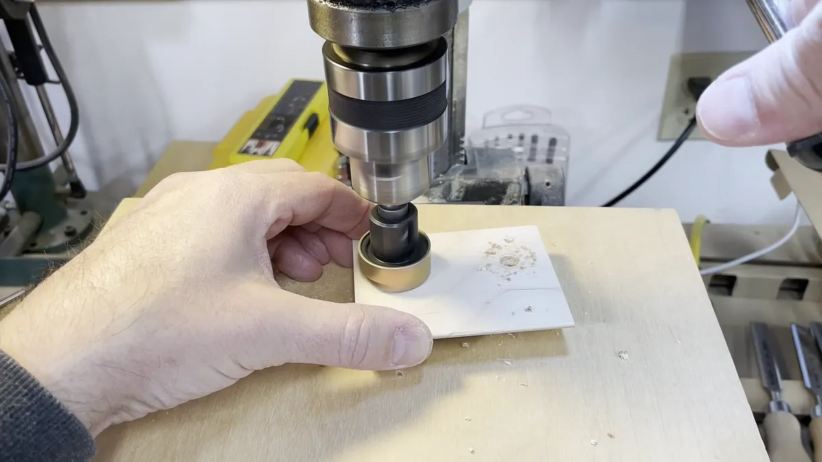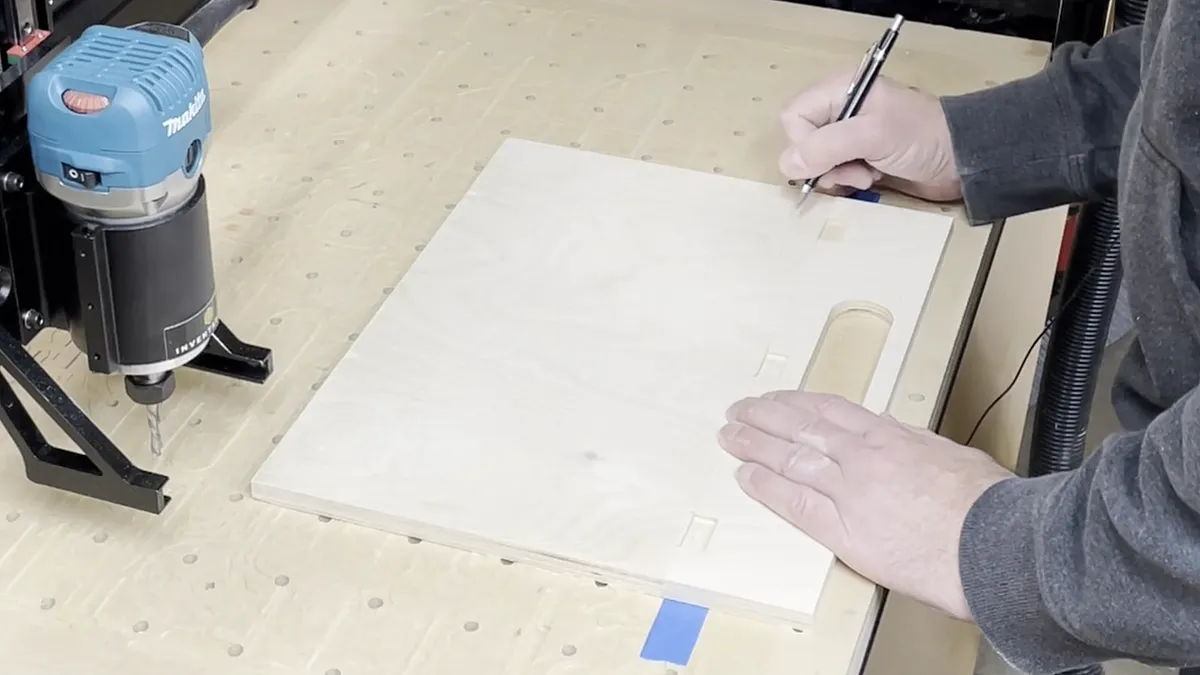 The hinge recesses for the bottom of the board are a different depth and they are located on the opposite side of the board. Because of this we will need to flip the board over and cut those recesses in a separate operation. Don't let this intimidate you as it is fairly easy to get the board registered to cut the hinge recesses.