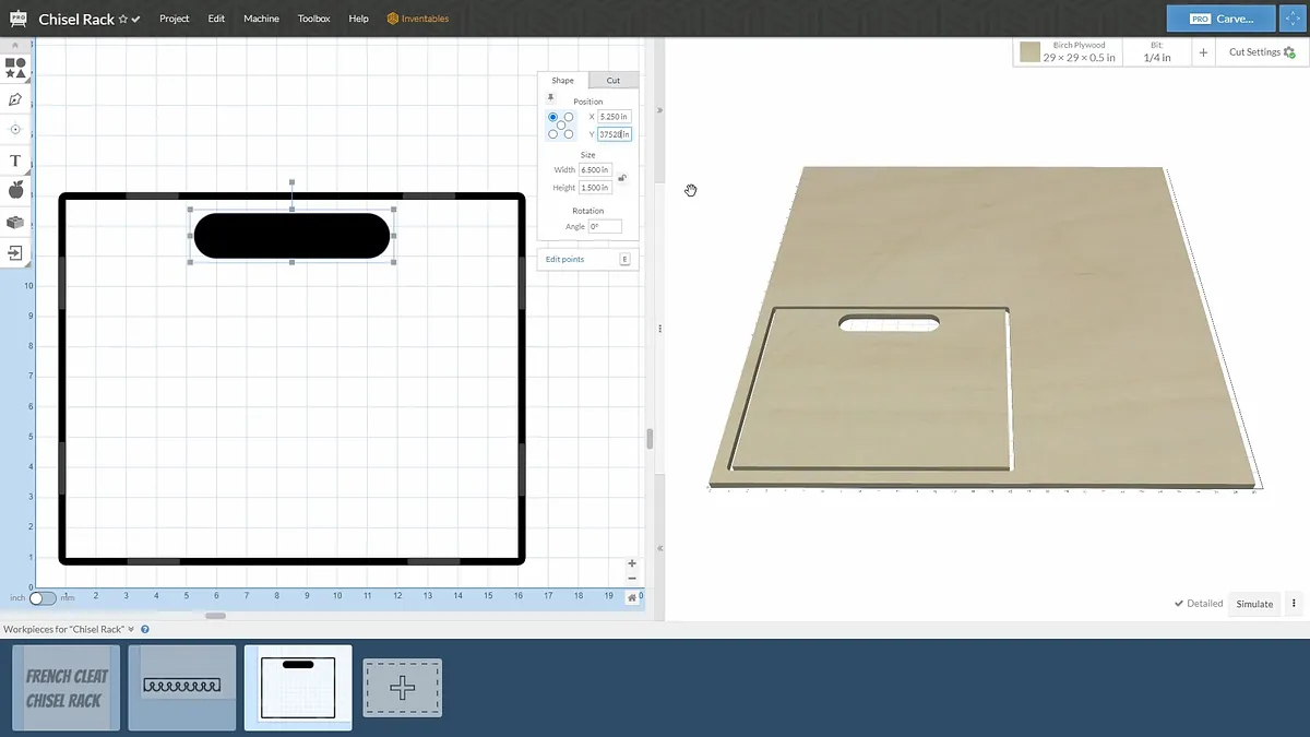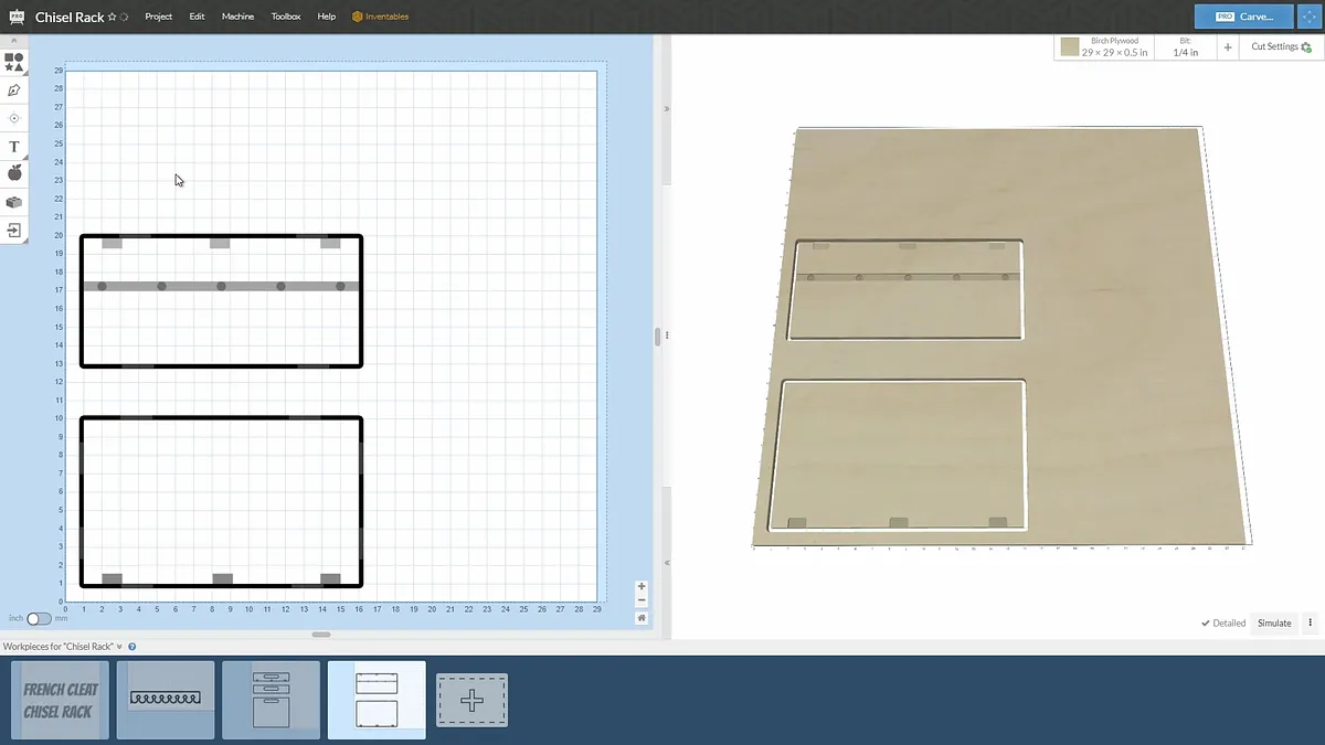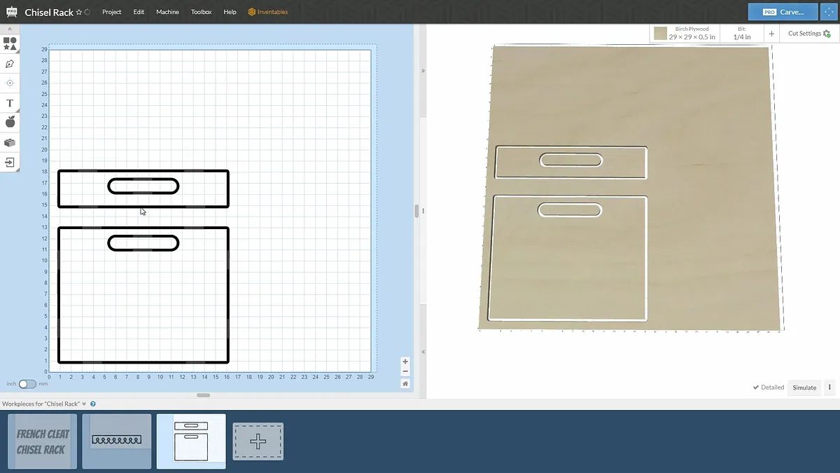 Start the CNC carving by cutting the chisel holder out of 3/4" plywood. This is a fairly straightforward carve.