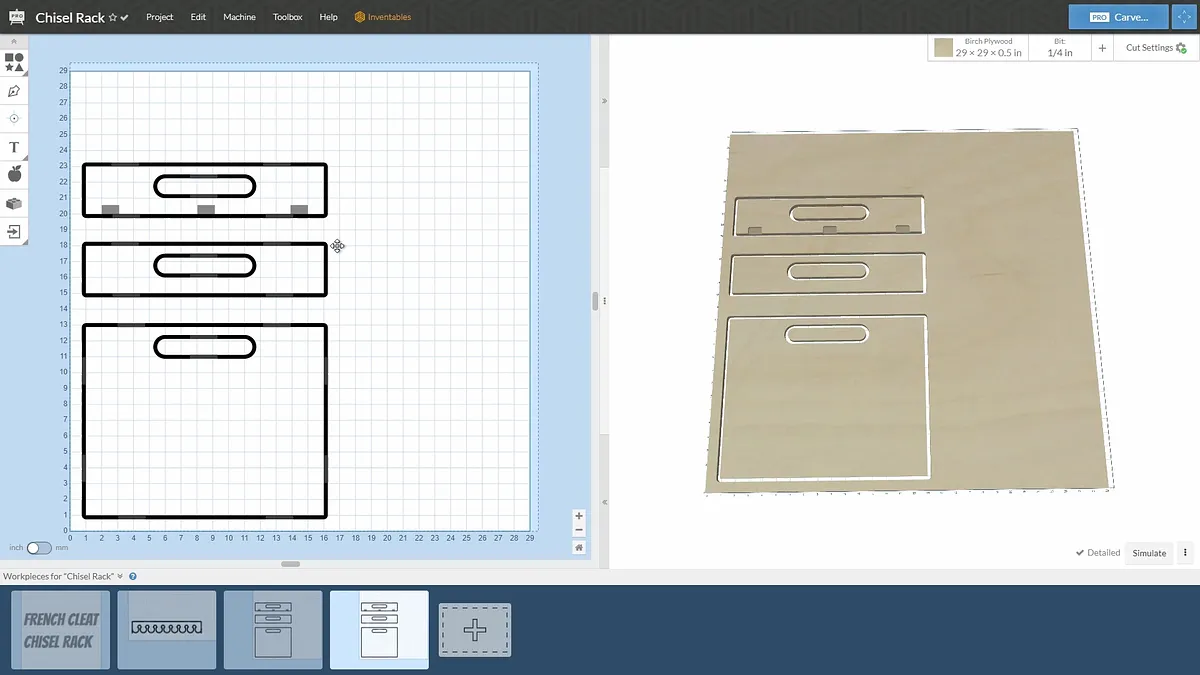 There were just a few design parameters I wanted to have in the chisel rack. I wanted it to be no wider than 15 inches so there would be minimal space between the individual chisels. I also wanted to minimize the height of the rack, which based on the largest chisel, that would be a little over 12 inches tall. I worked on the layout of the pieces with some sketches using full dimensions to get the piece sizes correct before I entered them in the Easel software.