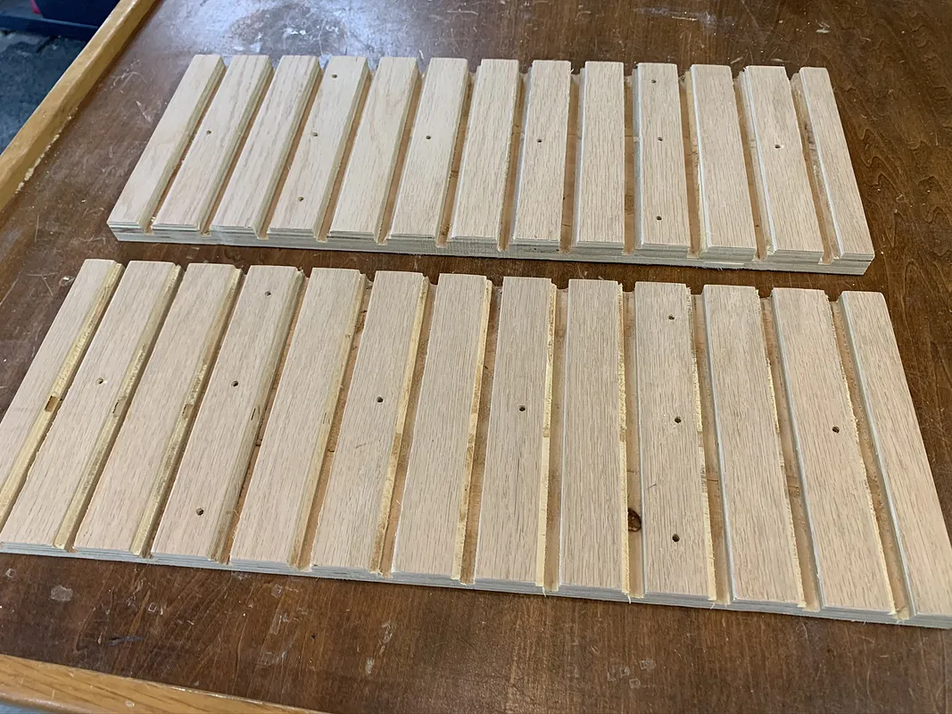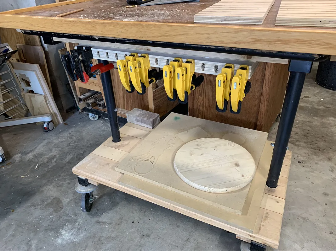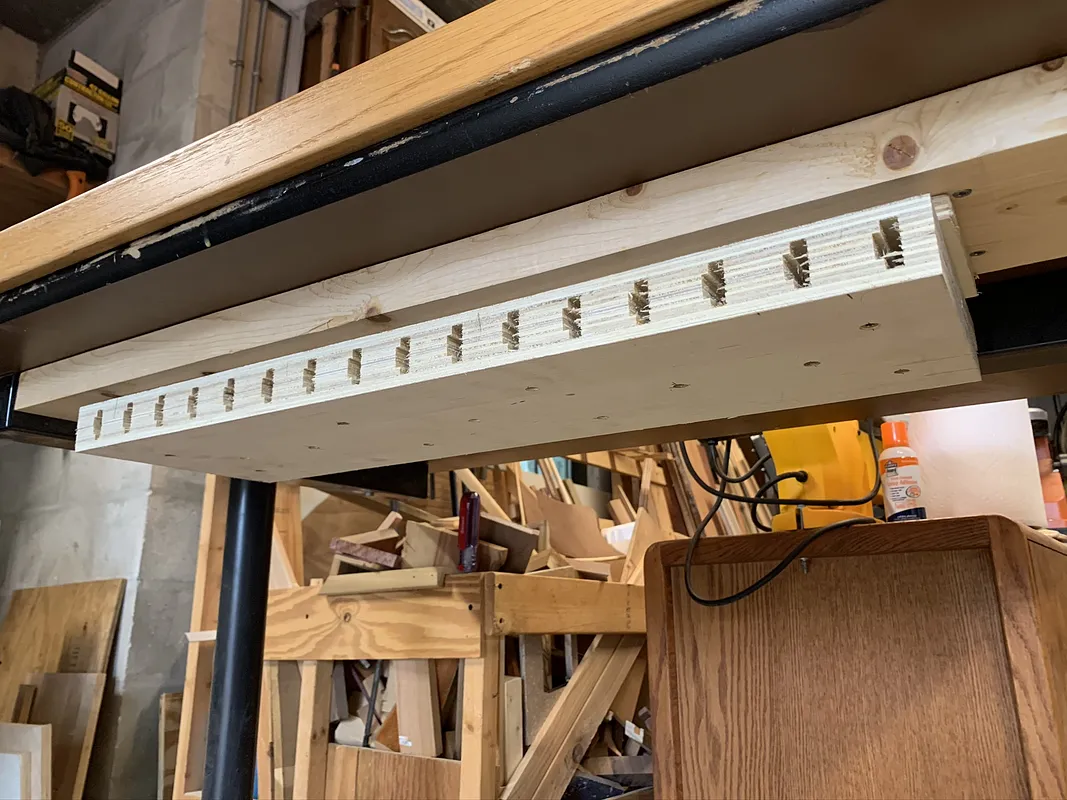 A rack I designed to store and provide easy access for my bar clamps. It was designed with DeWalt clamps in mind, but should fit most other brands (perhaps with small modifications).