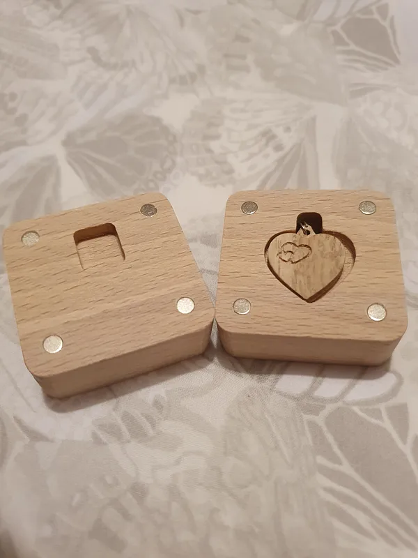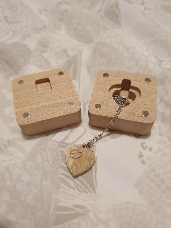 Carved heart shaped pendant(with chain attached) and box for valentines day. Heart is carved from Irish oak and box carved from birch. Box contains hidden dept to store the chain, and 4 magnets for securing the two pieces together