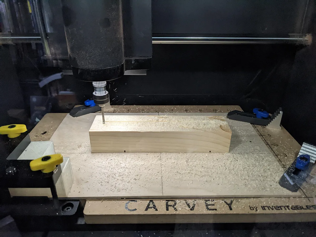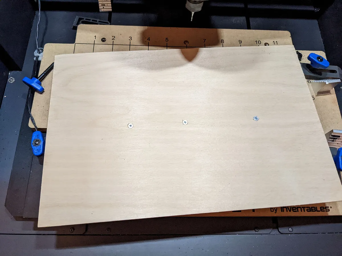 To secure the pinewood derby block to the plywood I used 1/4" countersunk screws. First, measure such that the long side of the block is 3" from the front of the plywood and wasteboard for your machine. Then, measure such that the short side of the block block is 2.5" from the left side of the plywood board. Clamp or carefully hold the block in place and use a few screws to fix the block to the board from the bottom. Be careful putting screws towards where the front will be cut as the machine will carve it quite thin.