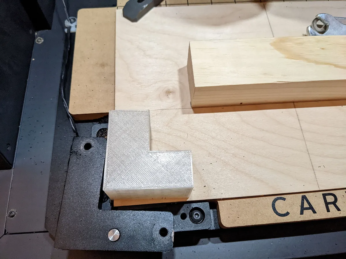 We are going to screw the pinewood derby block into a piece of plywood so that it is held tight to the wasteboard and can be cut on all sides by the machine. The standard pinewood derby block is 1 3/4" thick, and Easel expects our carving material to be 1.5" thick. The plywood is 1/4" thick so we create a spacer that is also 1 3/4" thick to give us our total desired thickness. Use some pieces of scrap or 3D print the spacer attached to this project if you have a printer available. If you have a smart clamp like the one found in the Carvey, be sure to place it under the smart clamp as shown in the photograph.