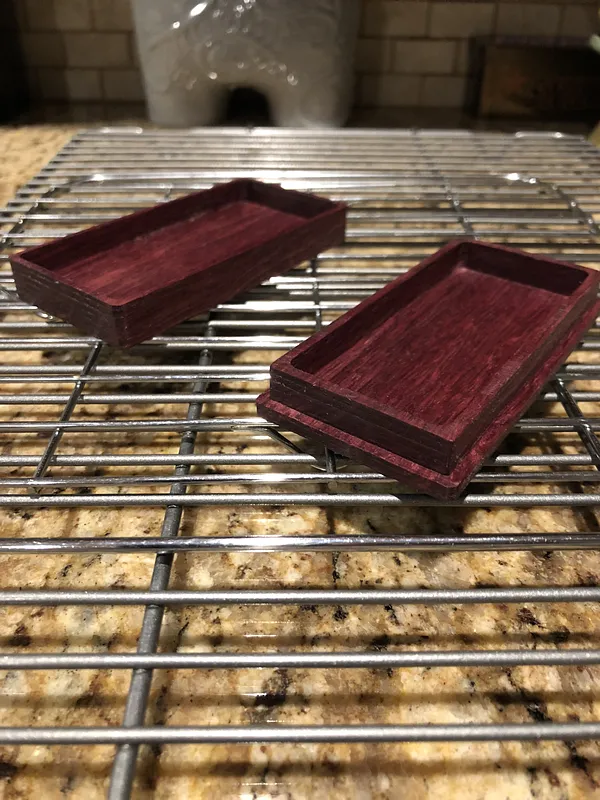 Note- The depth of cut depends entirely on the thickness of the material you're cutting. This box is half inch Purple Heart. I set the cut depth of this box to .35". The shoulder cut and the pocket cut should both be set to the same value in the depth setting. you want the mot space you can have while still maintaining strength in the bottom of the box. The "white" area between the shoulder cut line and the inside pocket cut will create the inside wall of the bottom of the box, The thickness of this wall is the difference of the shoulder length and width and the length and width of the pocket cut. I use 2 tabs per Lid and Bottom. I set them to the short sides and make them .08" tall and .25" wide.