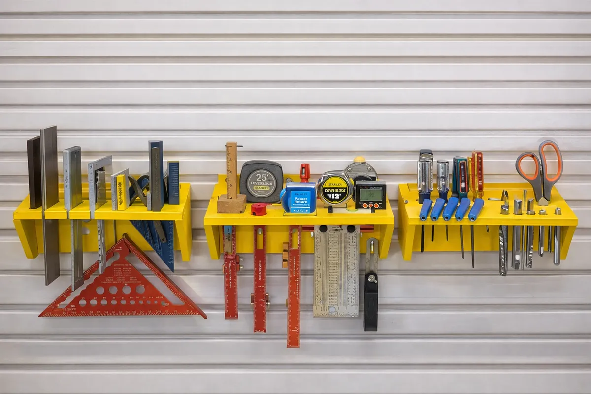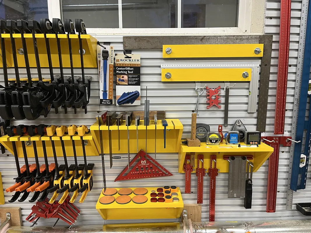 A set of CNC-cut tool organizers designed to work together as a clean, modular shop storage system. Includes racks for Levels, Squares, misc. Layout Tools, and misc. CNC Tools.