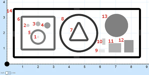 A 3"x8" pattern designed to check the X-Carve or other hobby CNC for indications of stepper motor lost steps, improper stepper motor calibration, and lack of perpendicularity between the spindle/router and wasteboar.