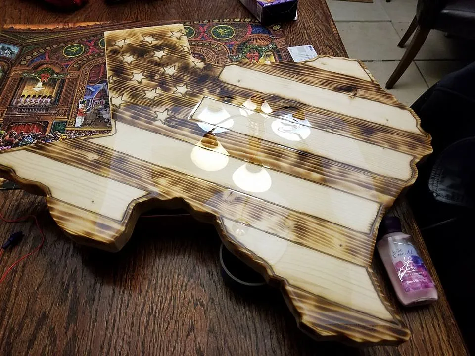 I basically overlapped a flag engraving over a texas shape cut. I did a white out of the extra flag on the outside of the texas shape. Used a 1/16 down cut bit. Burnt the wood before cutting.