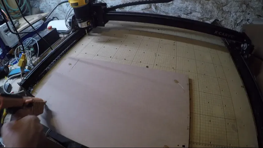 Instead of using mechanical clamps I like using hot glue to affix a piece of MDF to the Inventables Waste board. I leave the paper mask on the acrylic and I then use a 3M Super 77 spray glue to secure it to the MDF. You can use any clamping method that works for you. This is my favorite.