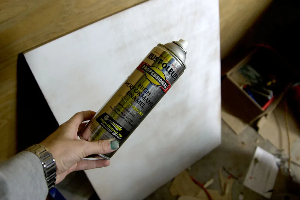 Find yourself a nice piece of plywood and cut it to 24in x 24in. Spray paint it white (or whatever color you'd like) and let it dry.