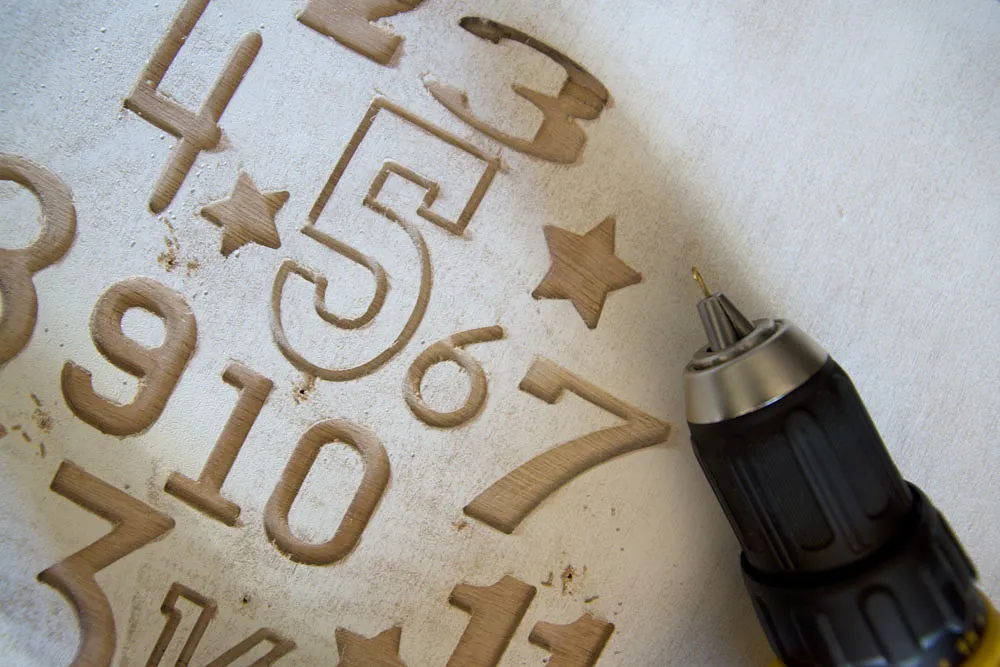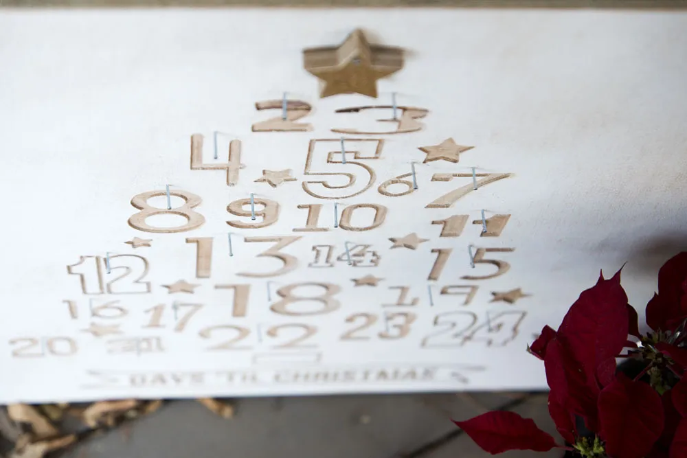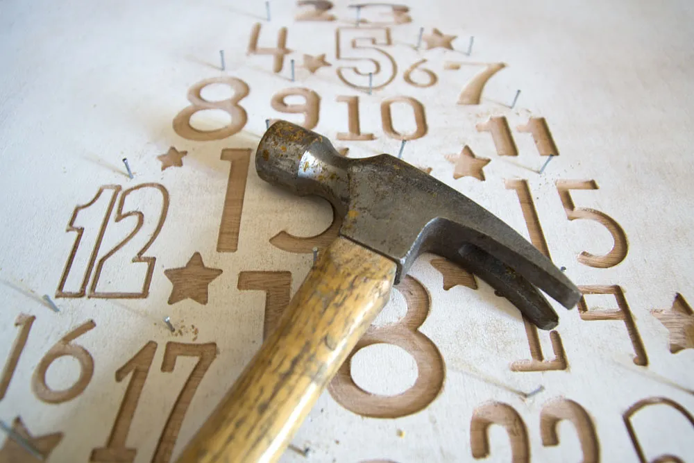 To have a place to hang my ornament on I drilled piolet holes above each number and then hammering in penny nails.