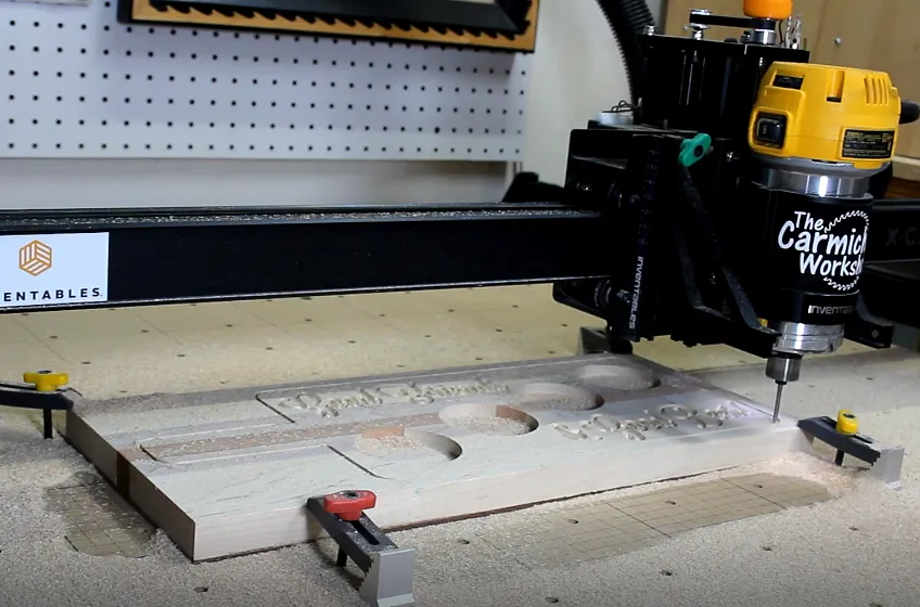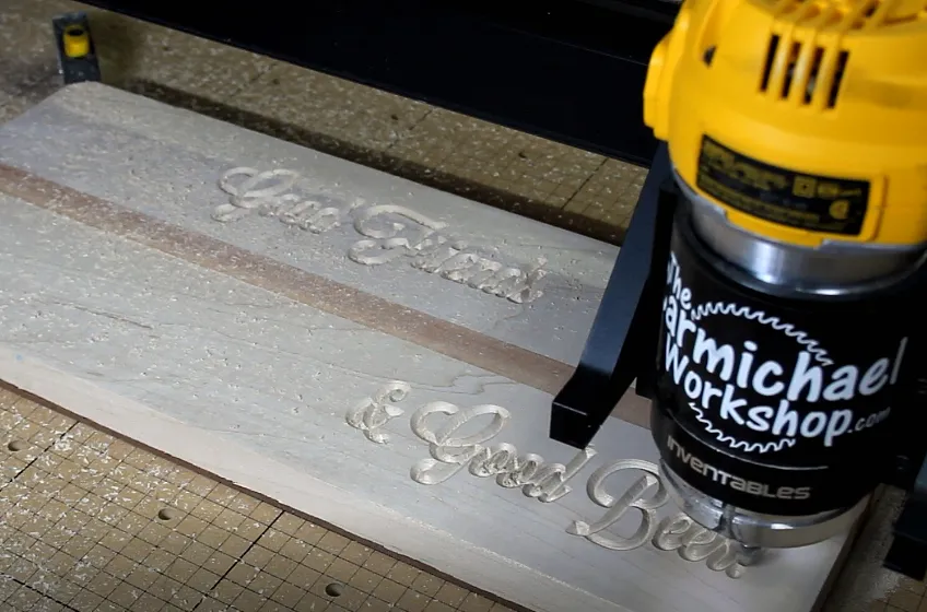 These beer flights can take about 1-2 hours to carve depending on the design. I used an 1/8" straight bit. For any parts that will be cut all the way through the board, use tabs to keep the part fastened to the rest of the board. I usually delete any text that I've already V-Carved, then undo the delete after the carve to bring the v-carved elements back. When finished carving, I use a multi-tool to cut the tabs to release the parts.