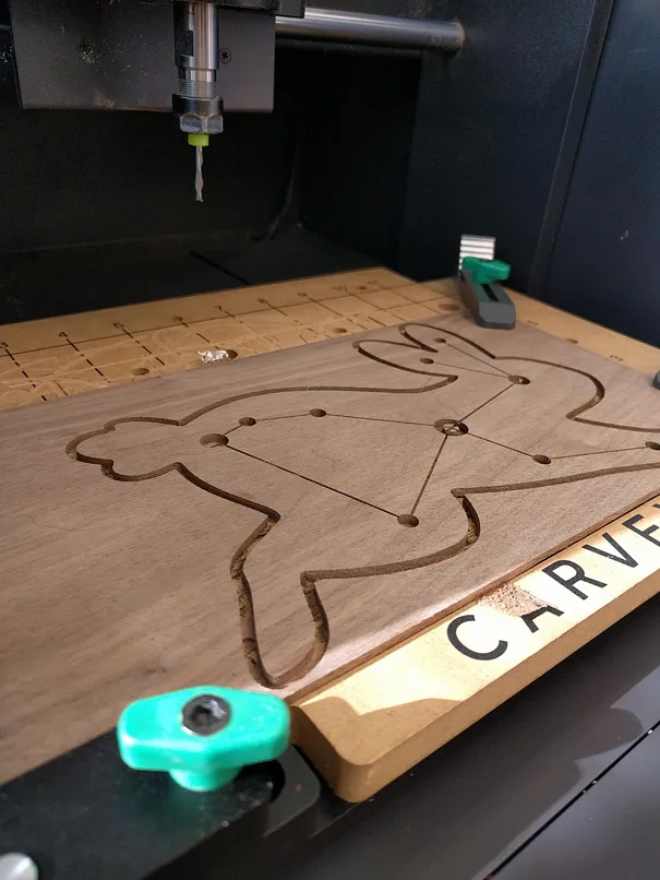 Clamp the first sheet of 6 x 12", 1/8" walnut to the machine. Carve the constellation lines, "Front piece: 1st cut" to begin, using a 1/32" downcut fish tail bit. I used the recommended settings for the 1/32" upcut bit. (2 minutes) Leave the piece clamped. Swap in the 1/8" downcut bit and carve the holes for the stars and the outline of the rabbit: "Front piece: 2nd cut". (4 minutes)