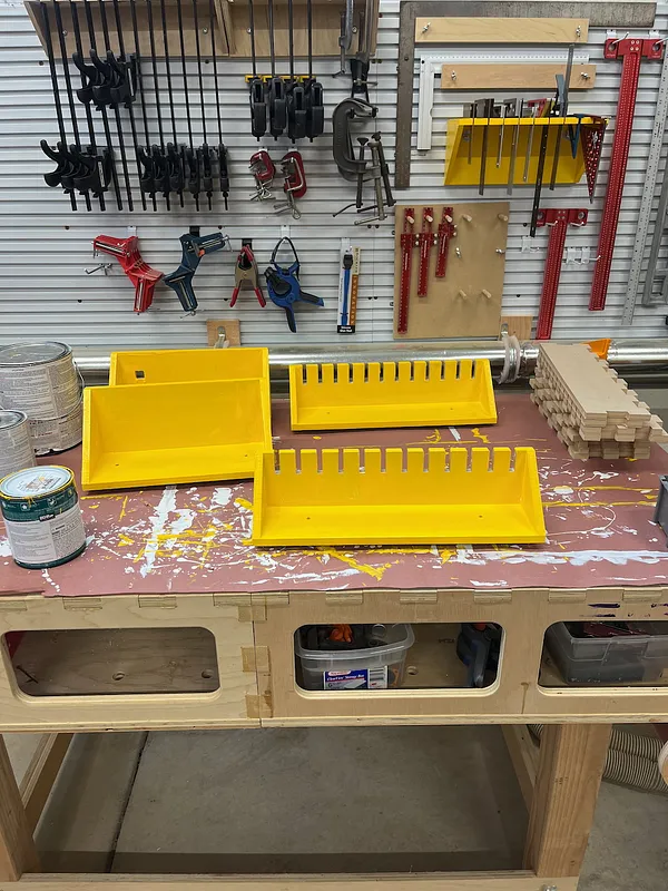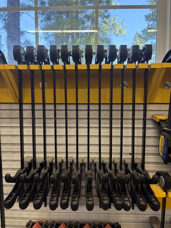 A set of CNC-cut tool organizers designed to work together as a clean, modular shop storage system. Includes racks for "F" Clamps and "Quick" Clamps