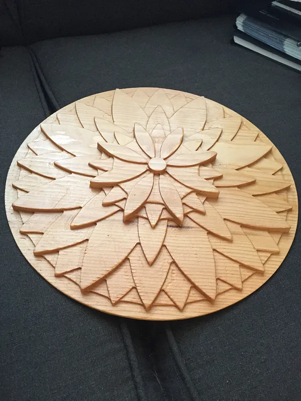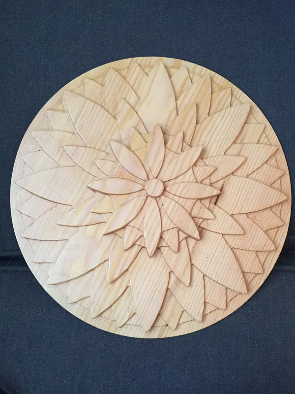 This is a simple mandala I carved from a piece of 1x10 fir and finished with a clear finish. It was a gift for my massage therapist and she has it proudly displayed in one of her treatment rooms.