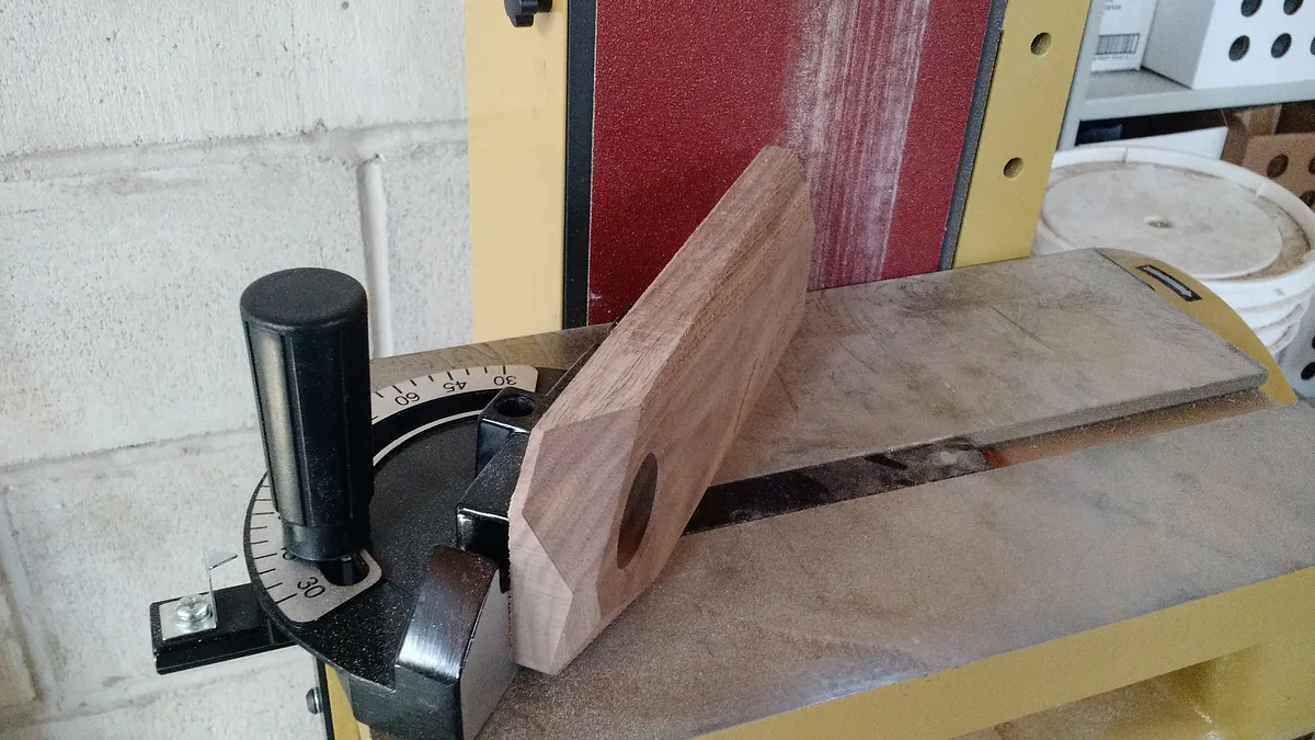For this design getting the angle perfect is everything. Instead of milling the angle I took it over to our belt sander. This let me set the angle and make minor adjustments to tune in the perfect balance. I found that 42 degrees worked really well.