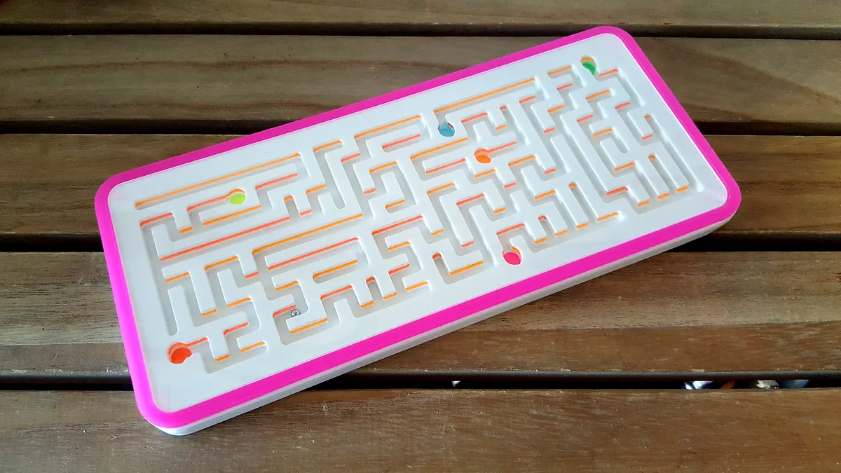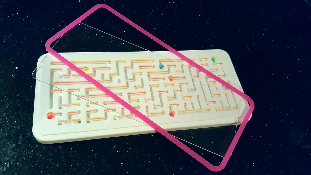 Drop in a 5/32" ball before sealing it up - I found one at Home Depot. I used double sided tape to secure all 3 pieces of my maze. You could also use clear glue for a more durable finish.