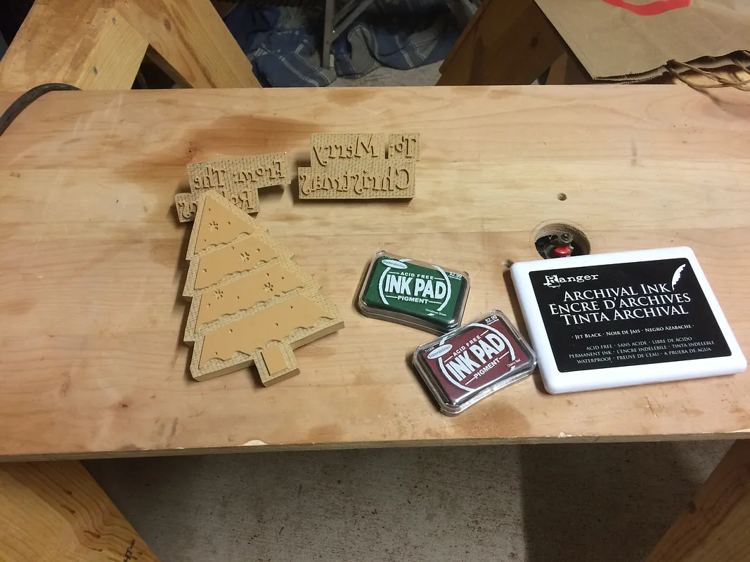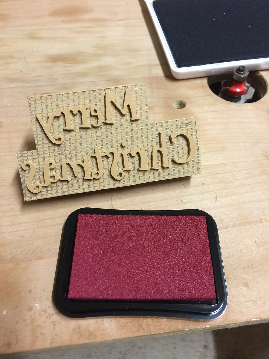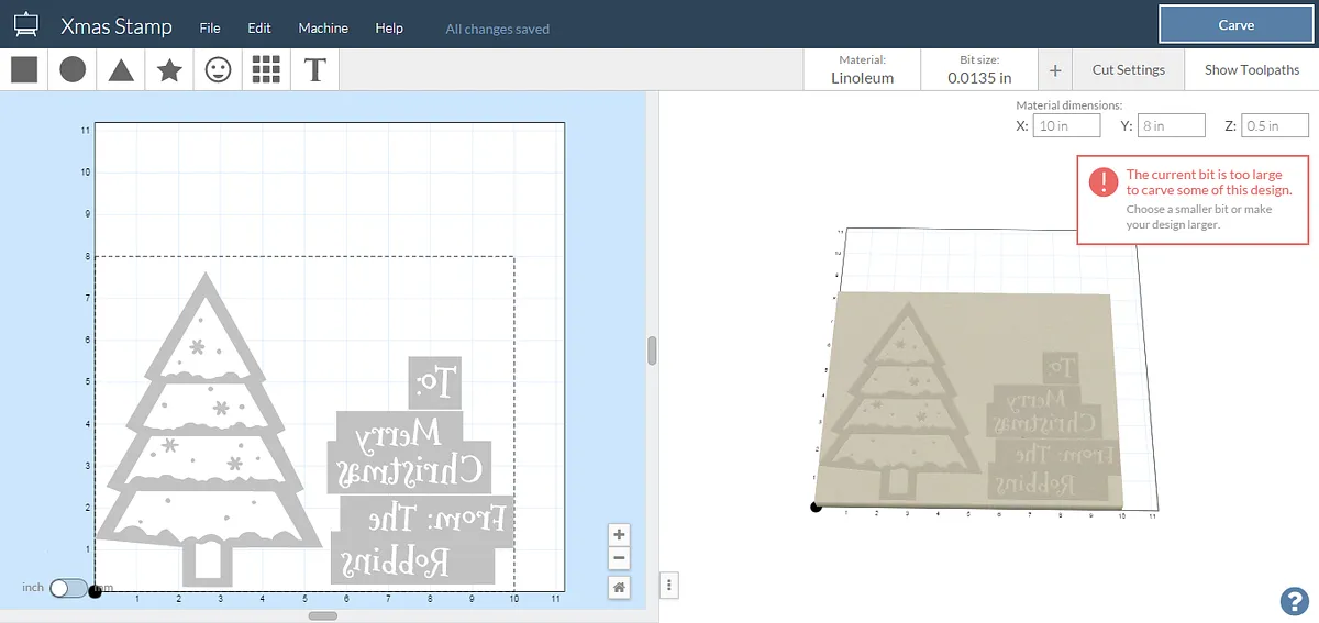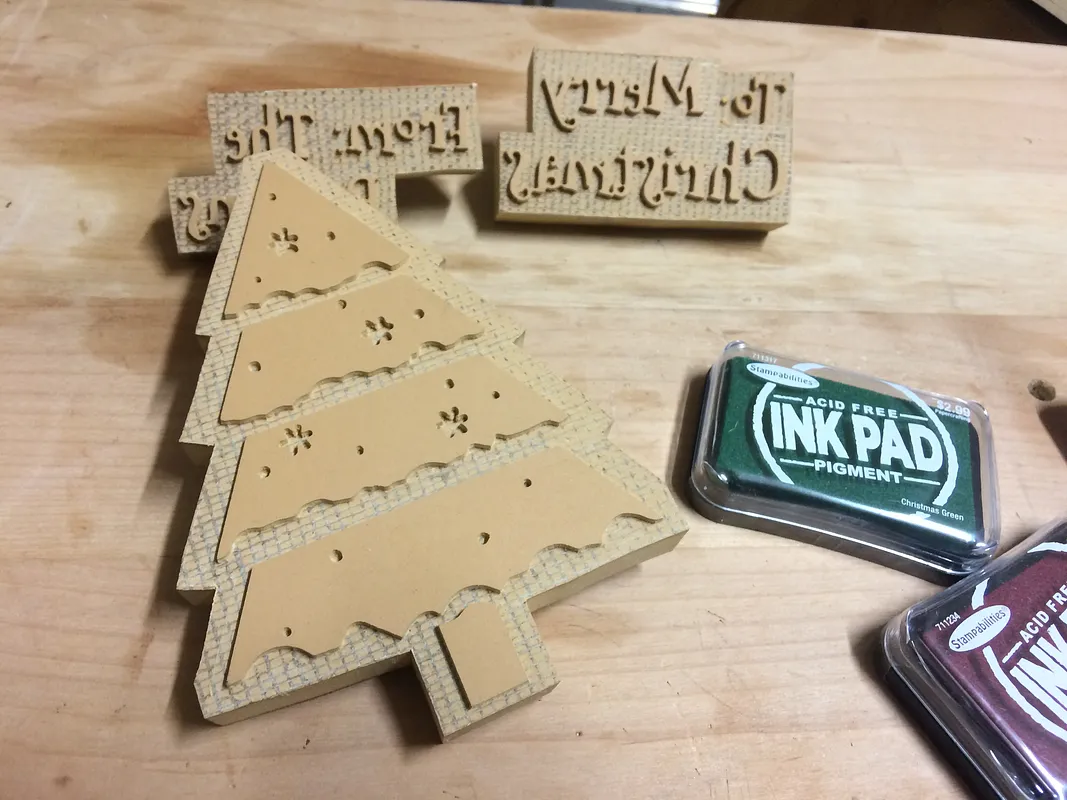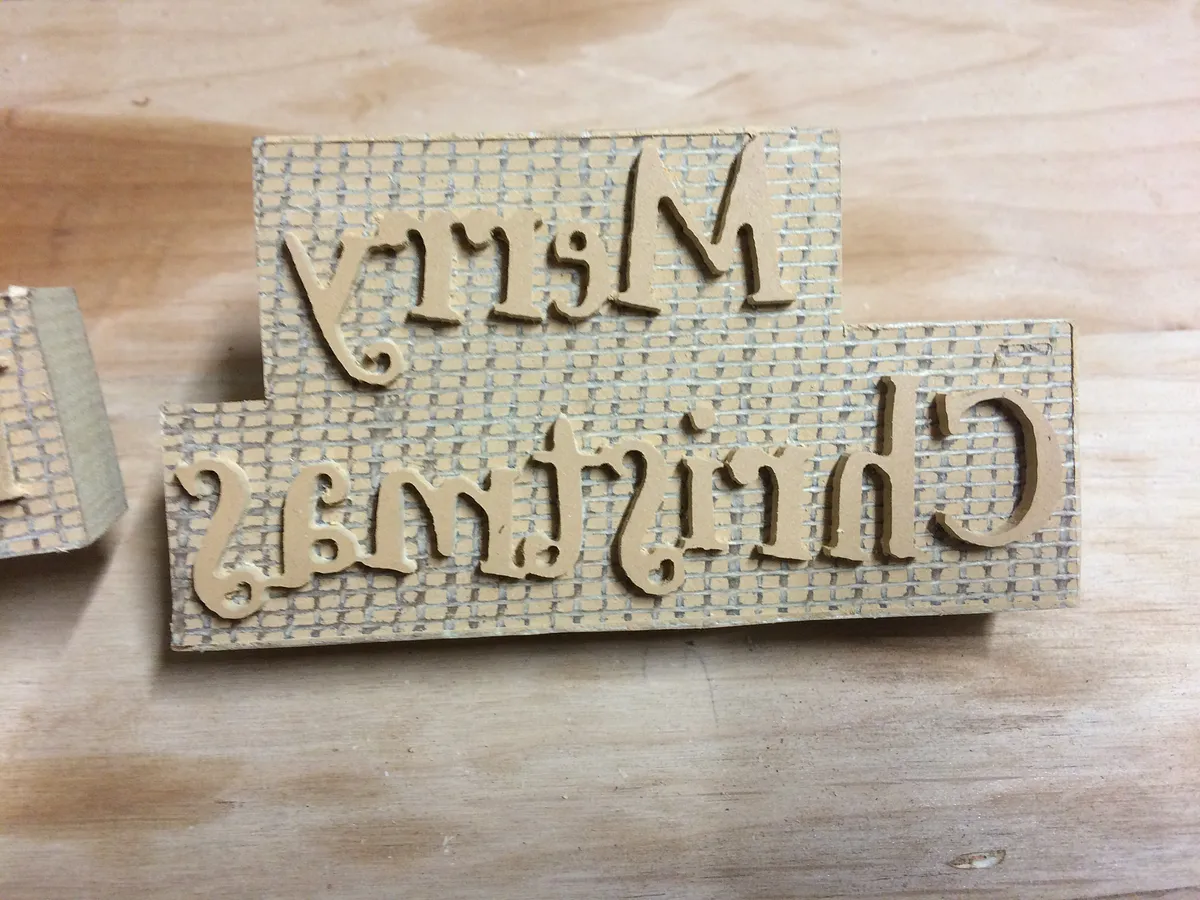 I also added background shapes to my Easel project and cut them out, leaving the stamp text and shapes in relief. To do this, set the stamp text and Christmas tree to 0" depth fill cut and create a shape behind it set to 1.2" or however thick your linoleum is!