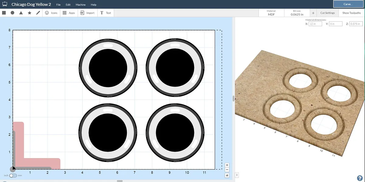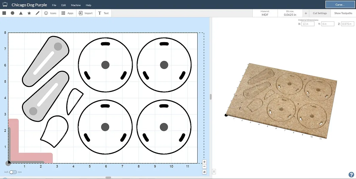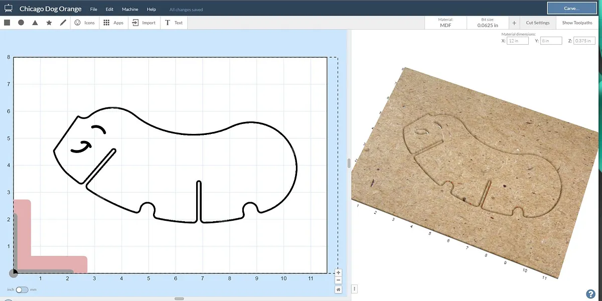 Just get right into it and carve "our main ingredient":hotdog out of a delicious slice of Orange MDF from the Inventables store. We used a 1/16" fishtail bit for this whole recipe.
