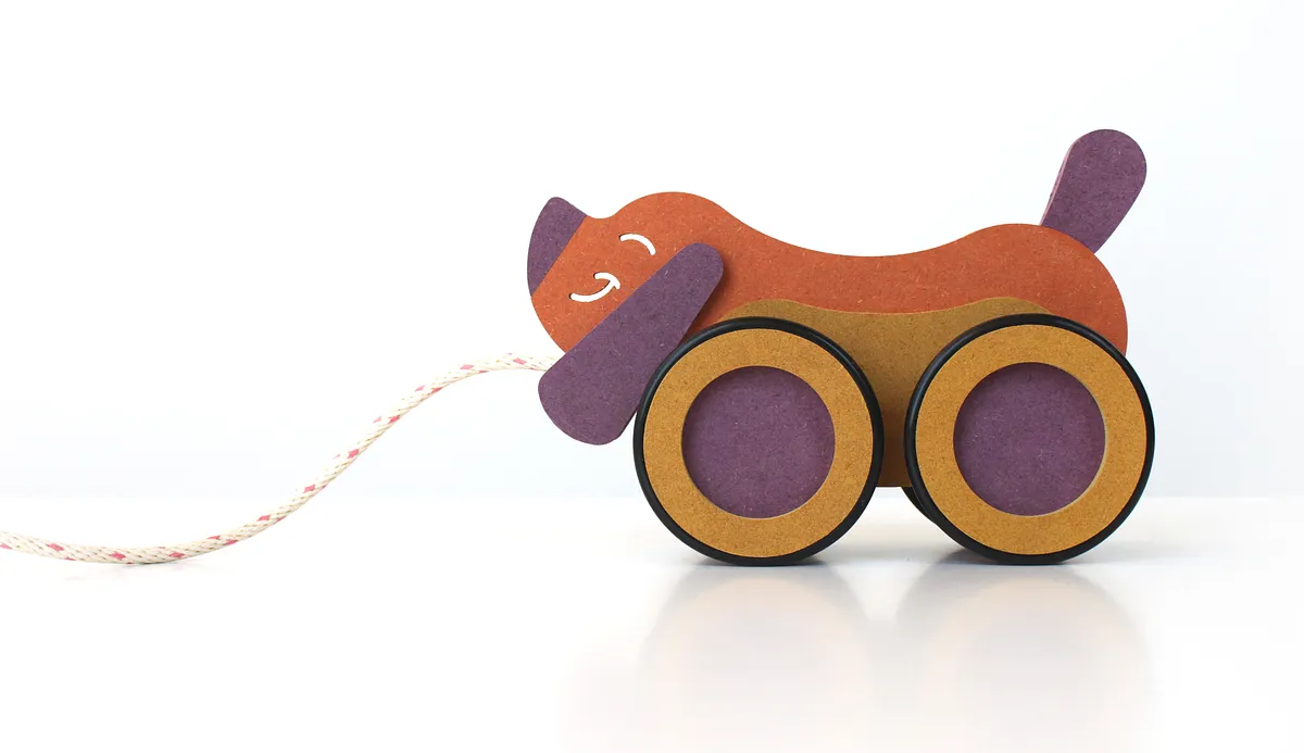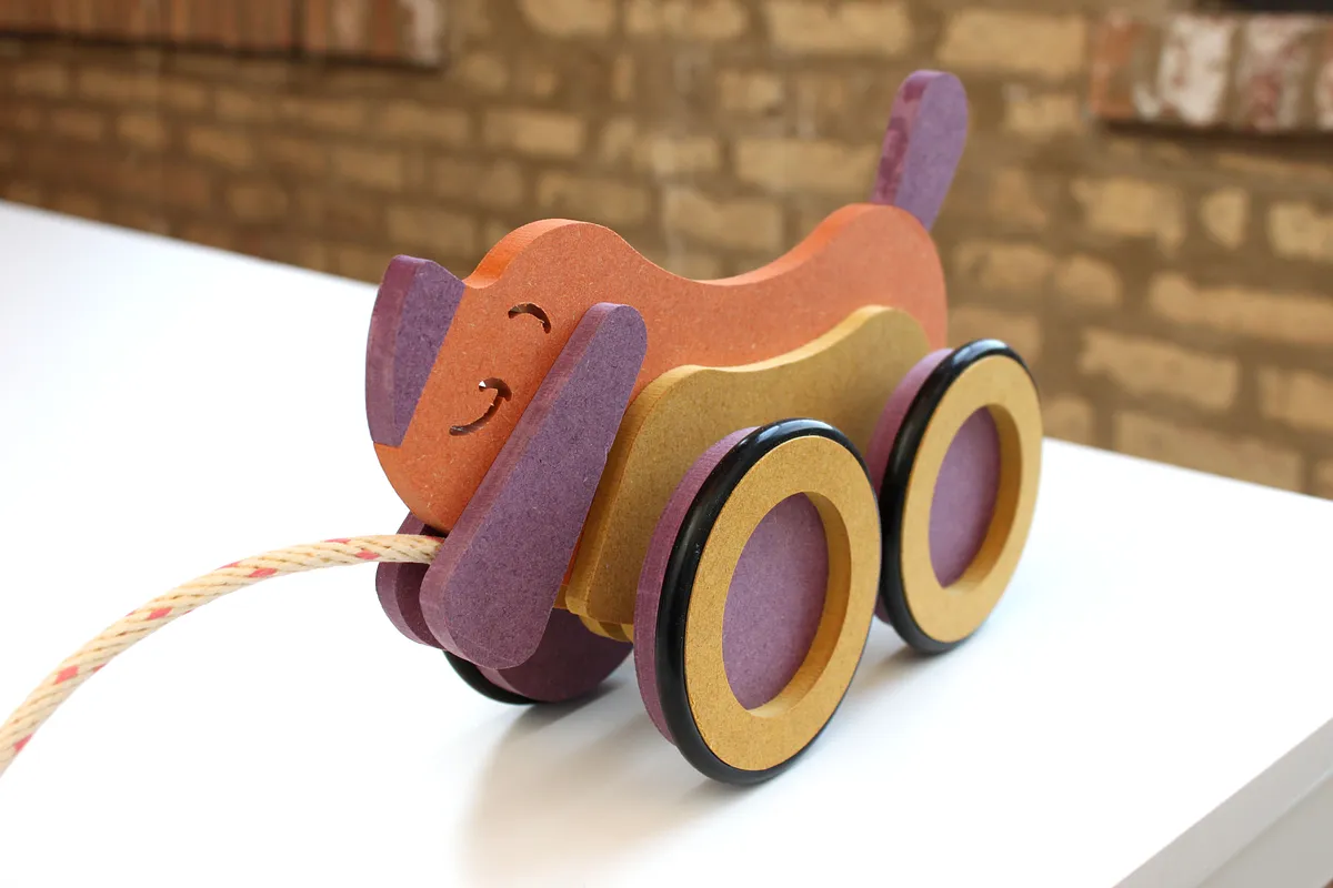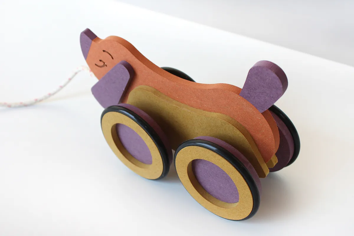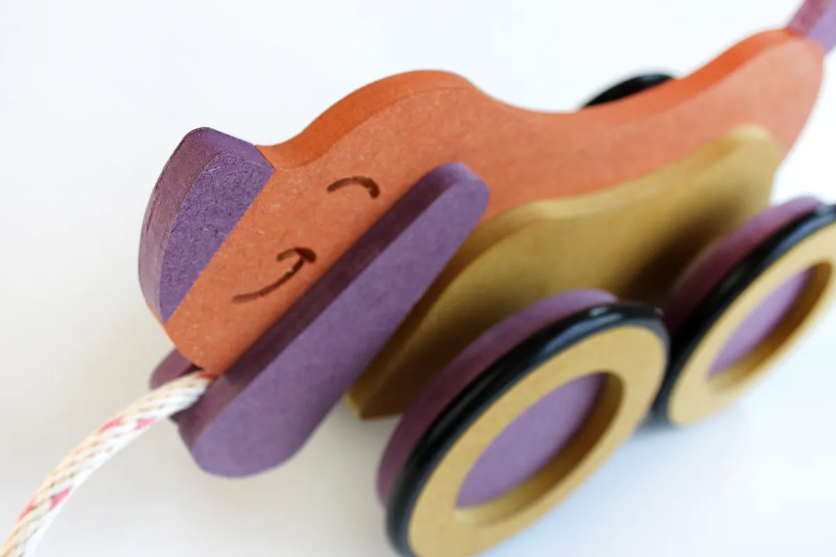 First, use some wood glue - just a little - and glue the nose and tail onto the Dog. Cut a short piece of 1/2" wood dowel and trap it between the ears when you glue them on. This will be to tie your pull string around.