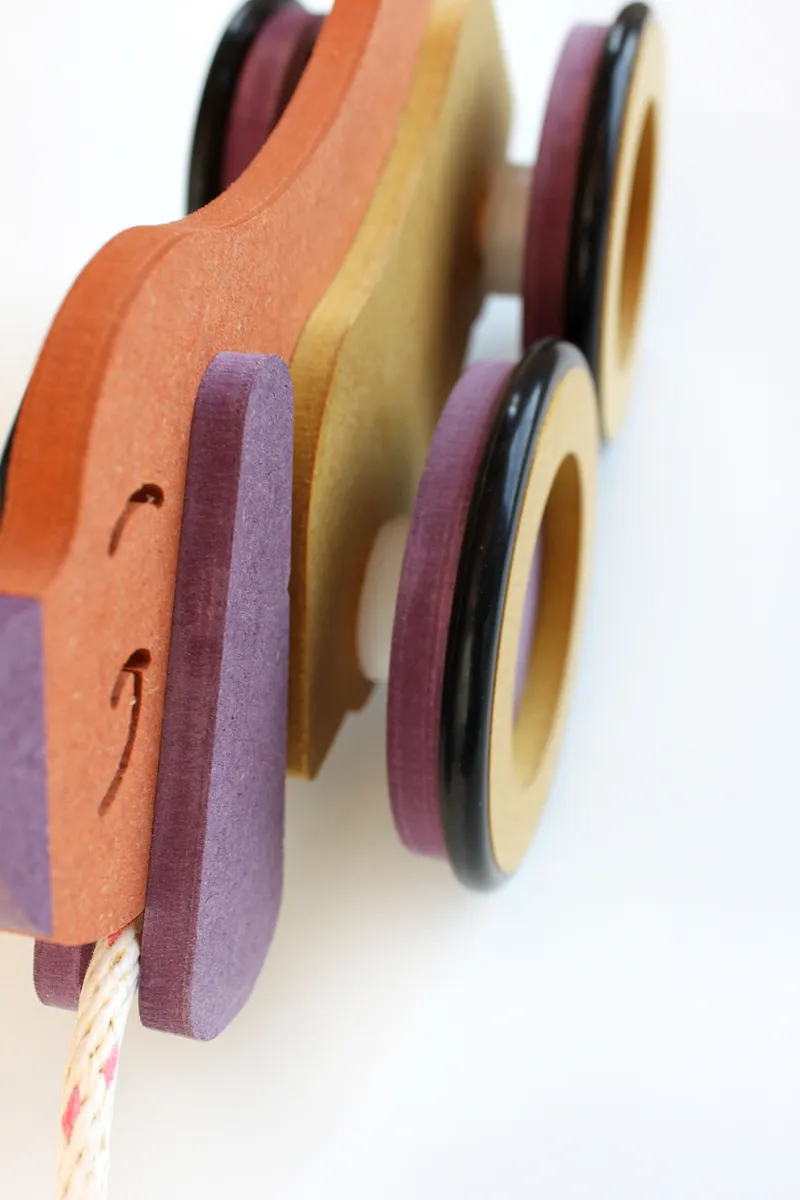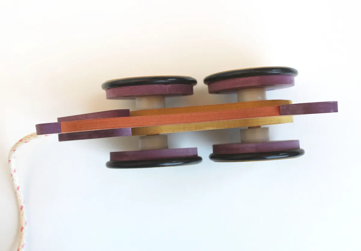 Once the wheels are complete, cut the axles from a 1/2" dowel (axle length will depend on spacer thickness - trial and error may be involved). Run the axle through the body and spacers and glue into the wheels.